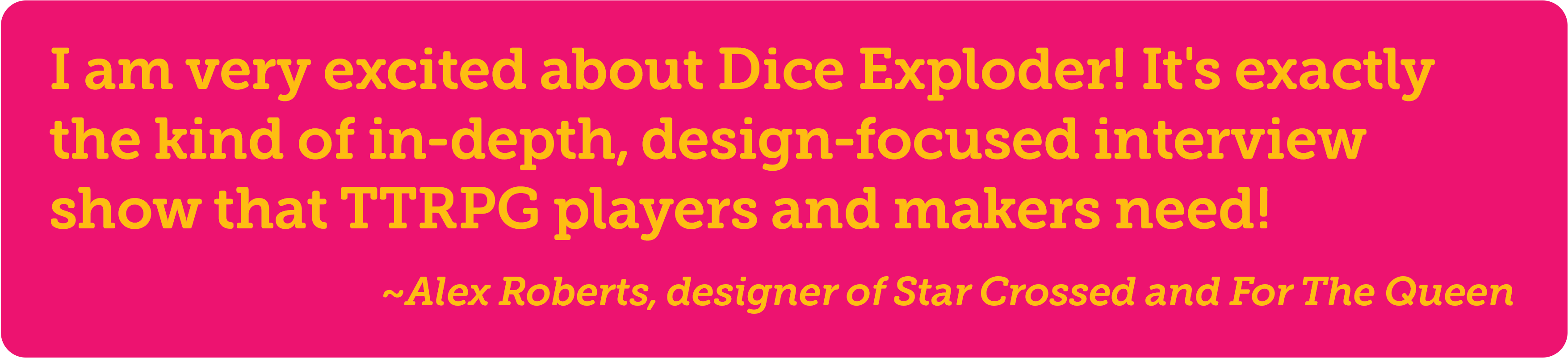 Hello and welcome to Dice Exploder! My name is Sam Dunnewold, and each week on this podcast I meet up with a new cohost and we take a single tabletop RPG mechanic and break it down as deep as we possibly can. It's a show about studying the nuts and bolts of how these games work, from crunchy tactical combat all the way to one word lyric games.
