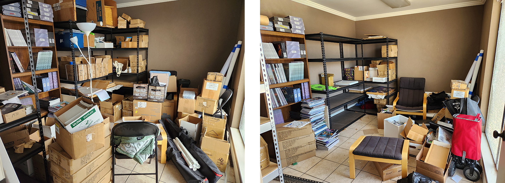 That shelf they're sitting on is a newly cleared space where I'll be storing all of the items that will ship out as part of this project. The fact that I have a cleared shelf is a triumph. This unit sits in the jumble of a room which I showed you last time. It is still pretty jumbled, but progress is visible: