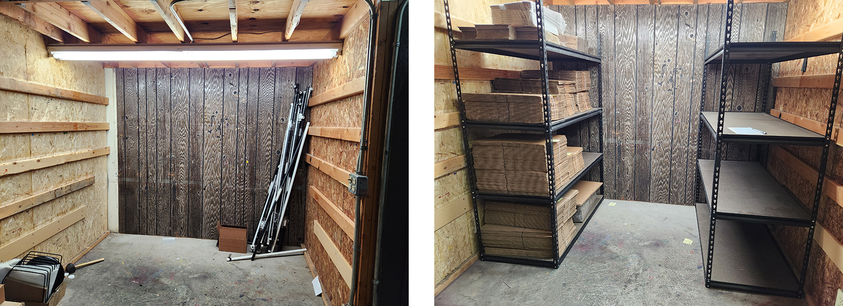 Those deep shelves from the jumble room are perfect for storing boxes. These boxes will be used in shipping out orders. We have piles of boxes ready to go on that empty shelf, we just need to think through which boxes go where.