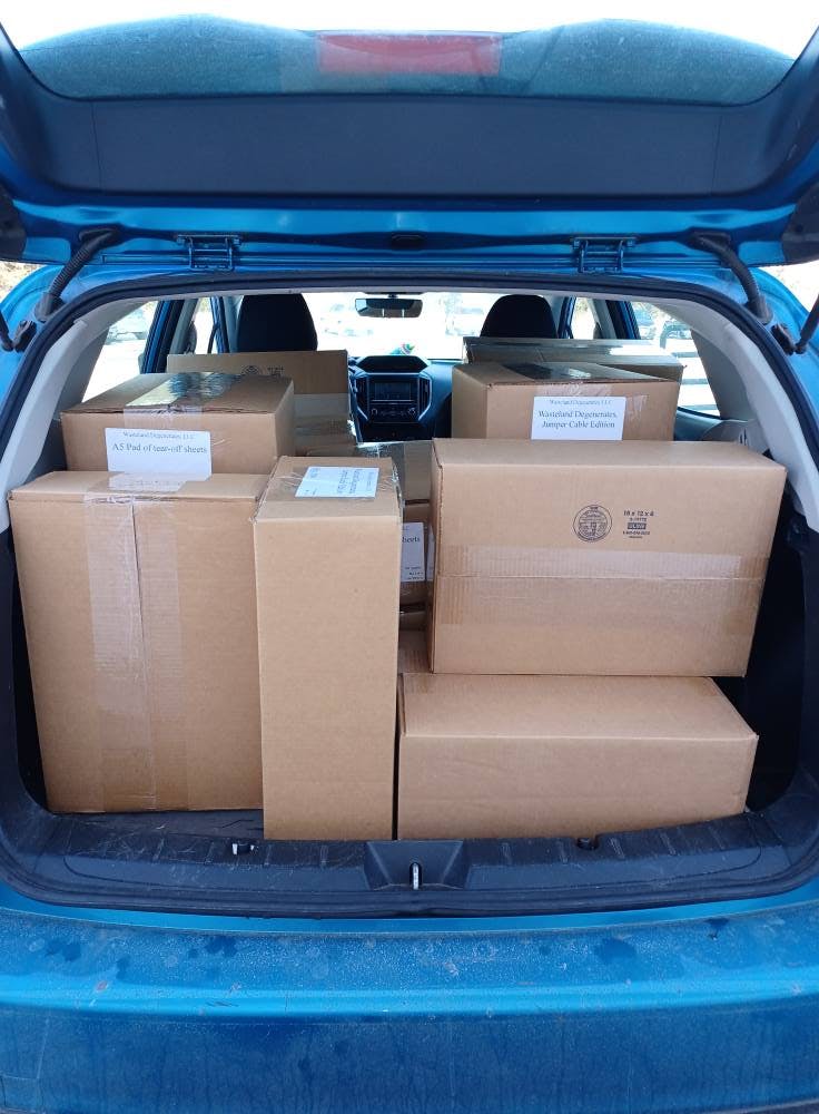 You may have seen that I picked up the books from the printer on Friday... if you didn't, here's 700 pounds (317.5 kg) of Wasteland Degenerates in a Subaru: