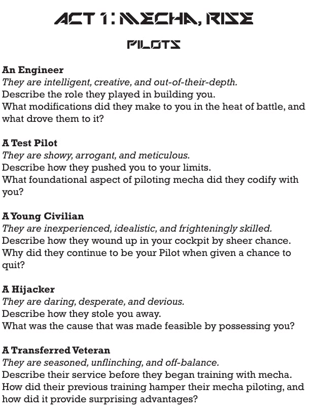 After choosing some details about your Mecha, you'll pick your first Pilot - while you are the machine, this is the character who guides you into battle and the history books, changing you through your mutual experiences. You'll be prompted to provide some details about them, and then you'll pick an event that occurred during your time together. Some of them will be good, some of them will be bad, but all of them will ask you questions about what happened and how it affected you. Eventually, that first Pilot will stop piloting you - you get to detail the why and the how of it - and you remain behind, alone.
