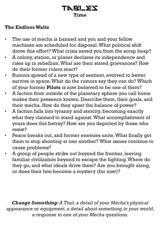 The player will then Rest by picking an option for how much time passes between Pilots in-game, setting a real-world timer, and closing their eyes, putting them in the space of the world moving around them without being able to act on it. At first the lengths of time, in and out of game, will be relatively short. As the game progresses, however, the time between Pilots will increase and your options for Resting will also involve events. Some will be what happens to you the Mecha as time passes, and others will be about the world changing around you.