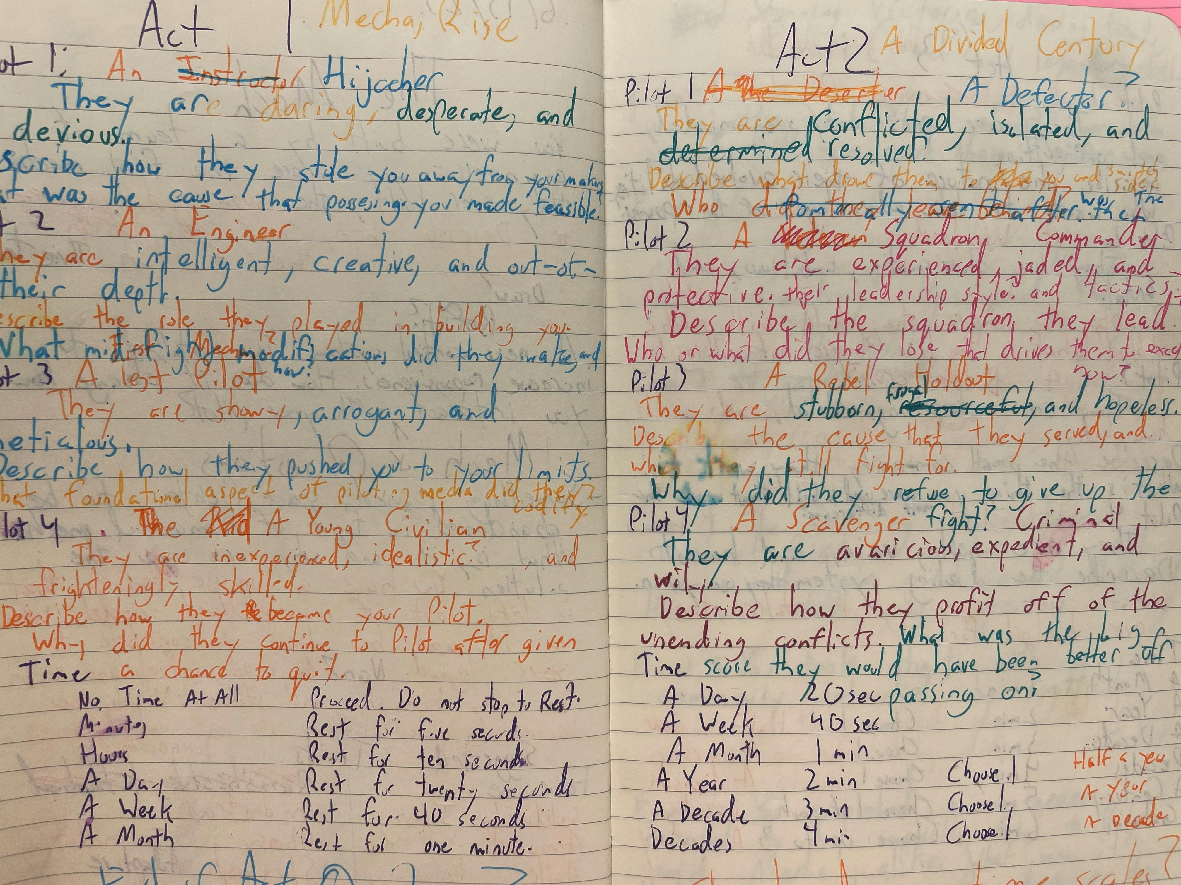 The original notes from PocketQuest 2023, made in bits and bites and probably way too many different colors.