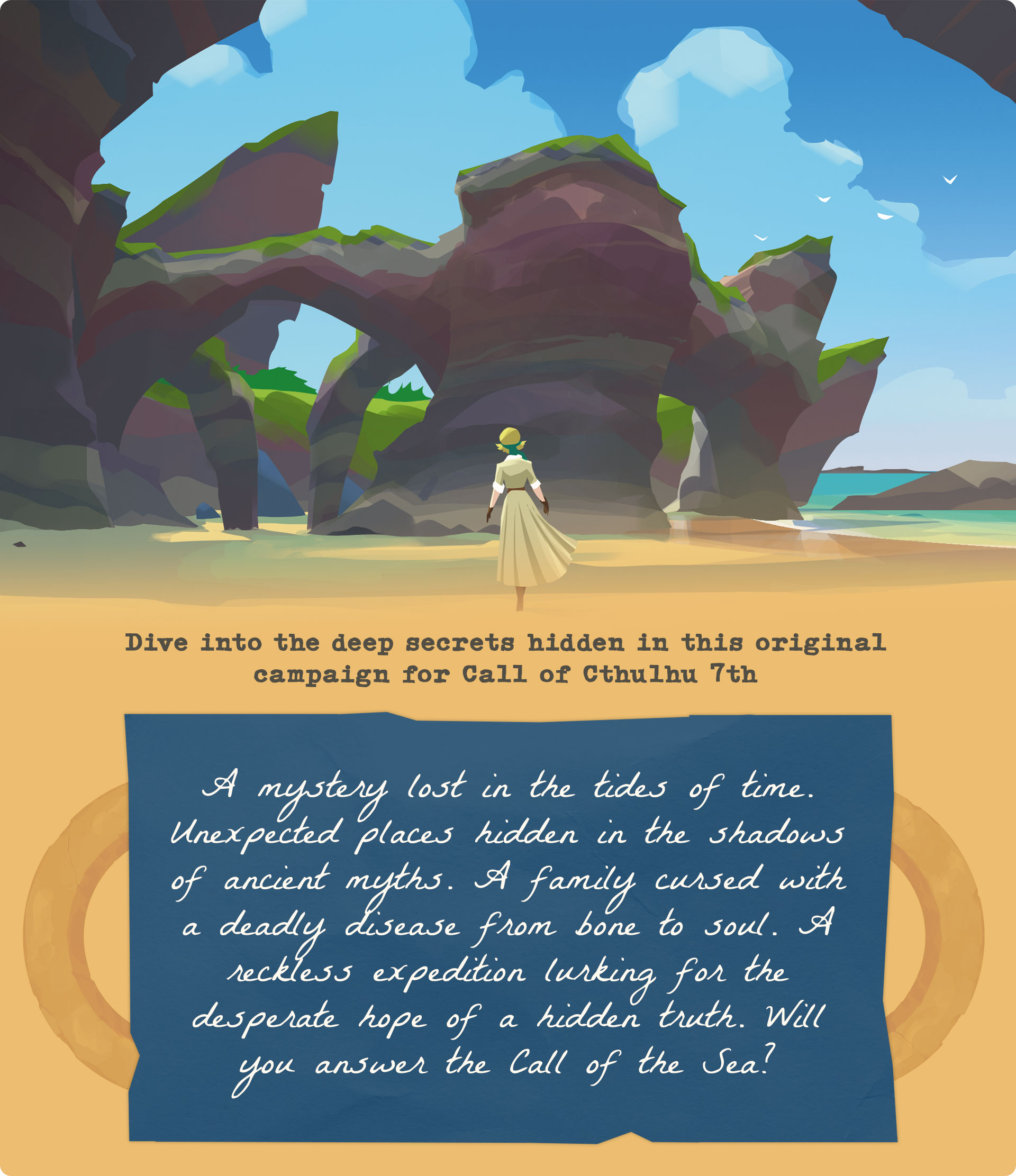 Call of the Sea: The Everhart Expedition is a brand-new campaign for Call of Cthulhu 7th Edition. Based on the famous video game Call of the Sea, it offers a different way of understanding the Cthulhu Mythos, along with the delightful taste of a renewed classic.