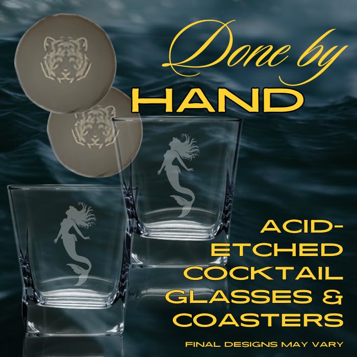 acid-etched cocktail glasses & matching coaster