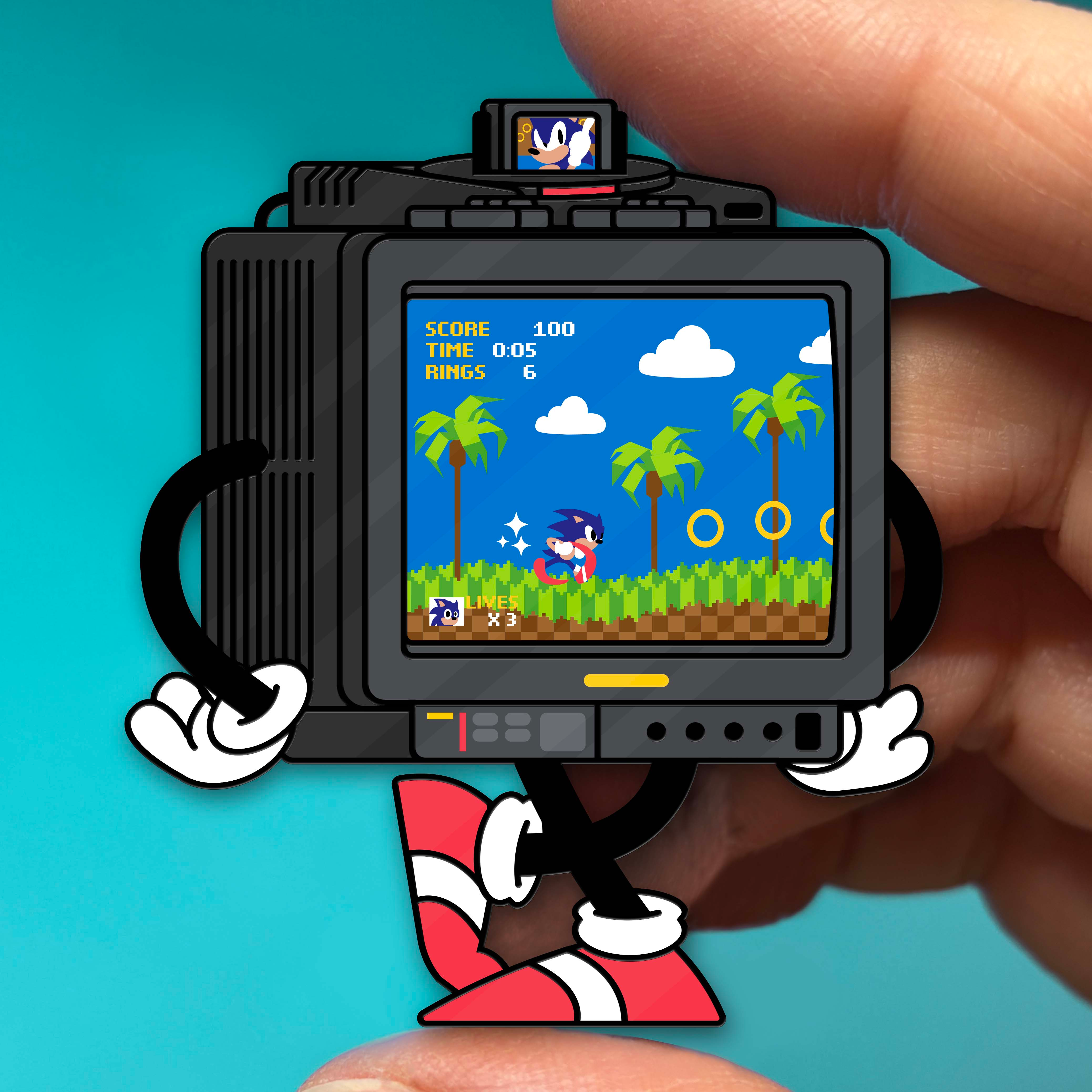 Hi everyone, Thank you all SO much for helping to make this pin come to life. I can't wait to see how it turns out! Next up, let's see if we can unlock the cute little Gameboy Color.. erm "GameBuddy" design. And, now that we've unlocked the initial goal, I can finally reveal what the next stretch goal looks like! I'm super excited for this one because Sonic the Hedgehog was actually my first ever video game growing up. My uncle gave my brother and me his old Sega Genesis and some old games and we fell in love immediately. I wanted to do this game with a different TV because Sonic always seemed like the cooler, edgier character compared to cute pudgy Mario. So a cool, aloof pose and more modern tv design were what we went with! I hope you like it and that we can get it funded, too! Thanks again, and please consider sharing it on your socials! -Caitlin