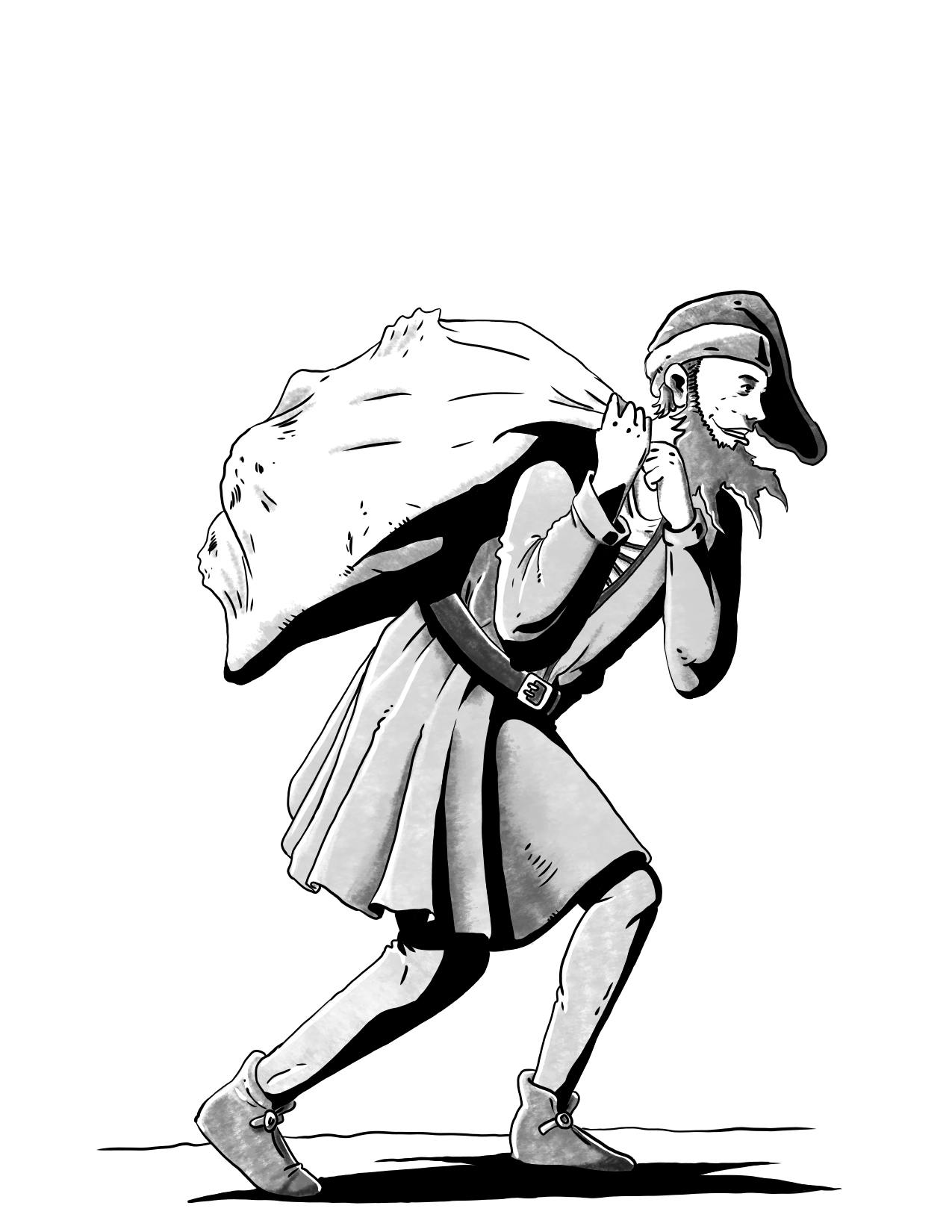 This man stands nearly seven feet tall. He has an impossibly large grin and a beard that bends at an unnatural angle. Dressed in tattered clothes, he holds a large sack over his shoulder that wriggles like something inside is struggling to get out.