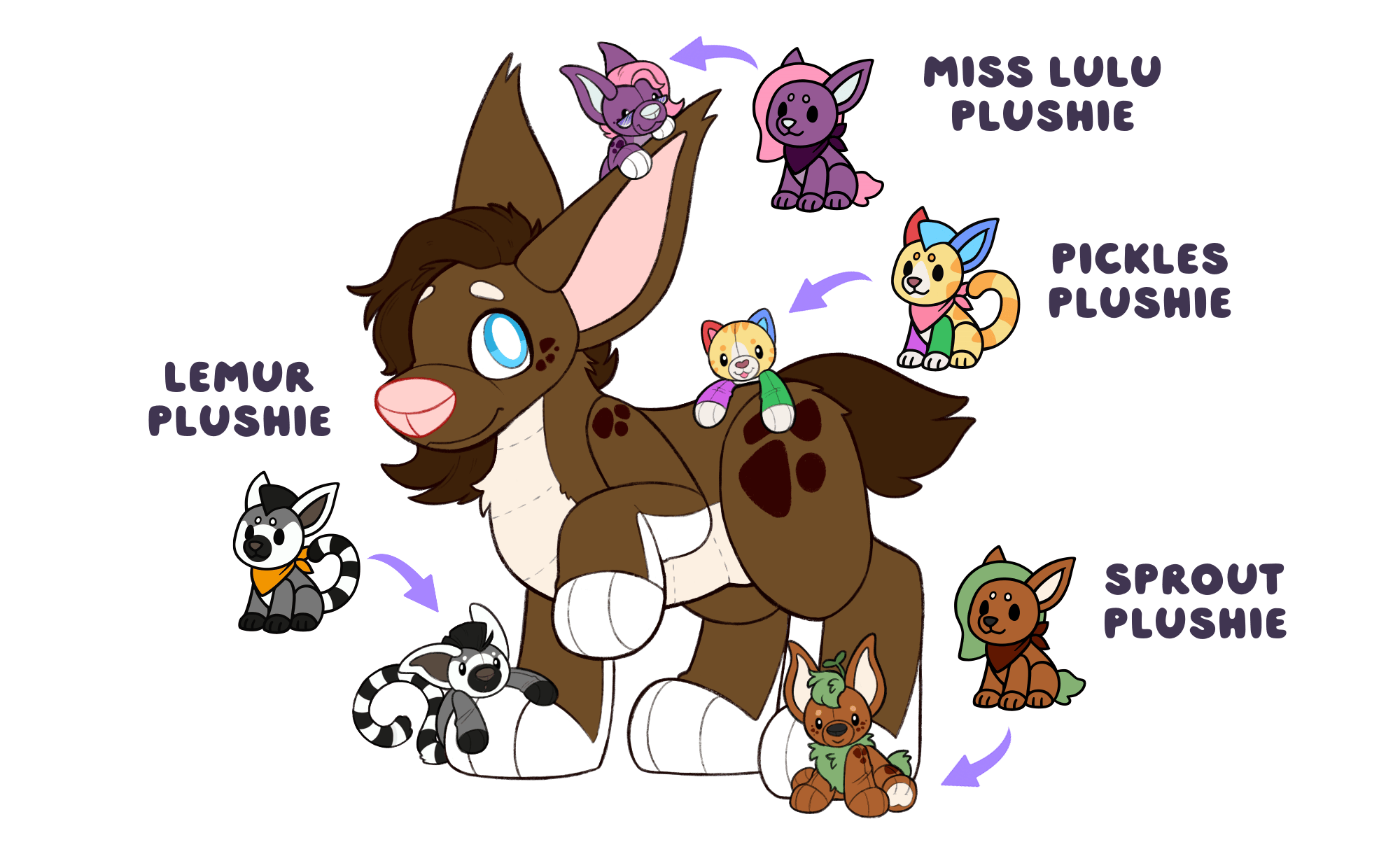 Examples of four plushies: Lemur, Miss Lulu, Sprout, and Pickles