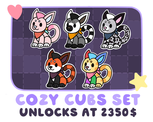 Example of the Cozy Cubs Pin Set. 8$ per Random Pin. 50$ per Full Set of 5 Pins.