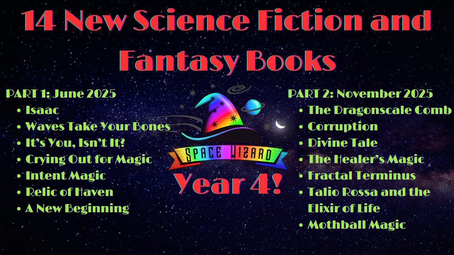 Now we bring you Space Wizard Science Fantasy Year 4, with 14 new books, including sequels to some of our most popular stories! This first half, Part 1, will release the first 7 books, with all of them released by the end of the year. Part 2 will be coming in November 2025 and will release through June 2026!