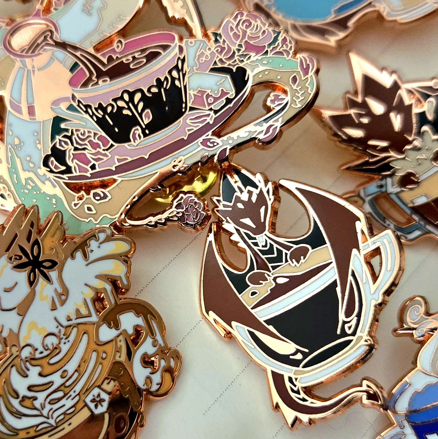 YAY!!! 💙 ✨Things are moving so smoothly for this campaign. The samples were just given to me literally finishing up the Kickstarter update for the super late Coffee Dragon pins! Wow what timing. It's great to have updates for both,-anyways! Here are the WIPS for the enamel pins that all came out perfectly! These are just samples so they are like sketches just to gauge colors and if there's any error in the mold, and they do not have screen printing or metal plating etc. So they aren't perfect and that is ok! Know the final product will be glossy and beautiful!