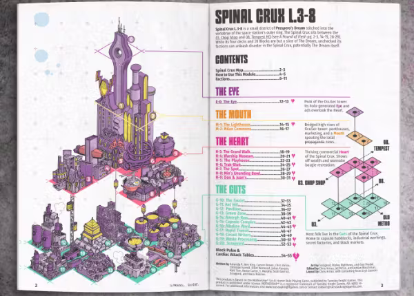 The work of finding ways to stitch together the Blocks was a lot of fun, re-reading all 21 Blocks and connecting the themes, Factions, NPCs, and Jobs all across the Spinal Crux District.