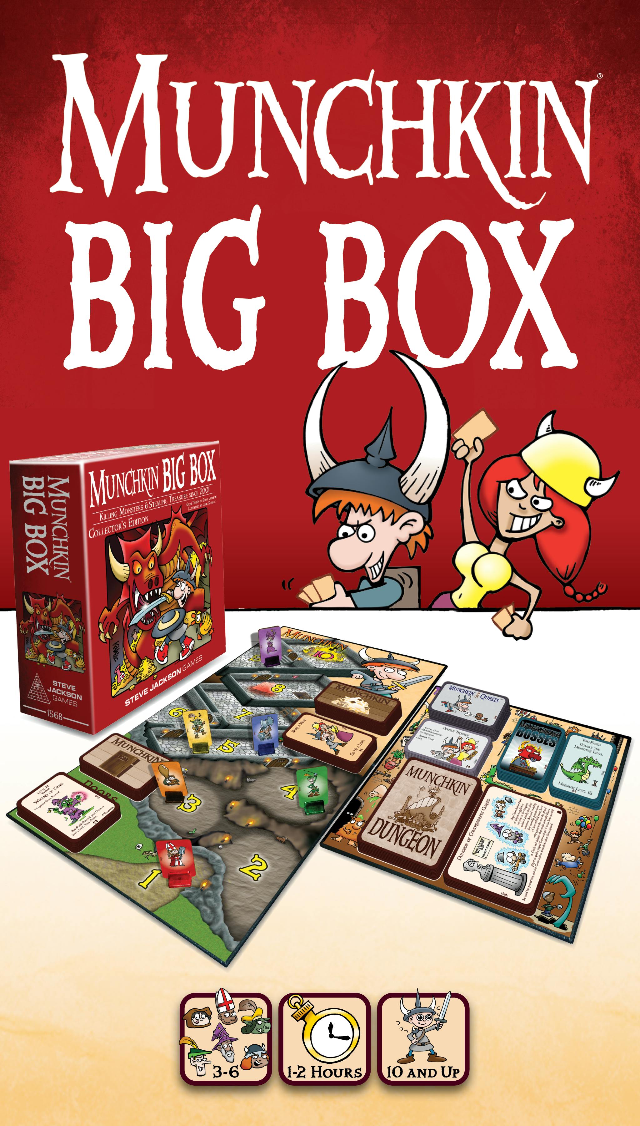 Dive into 25 years of chaos and monster-slaying, all in one gigantic box, the Munchkin Big Box! Kill the monsters, betray your buddies, and hoard the treasures like never before.