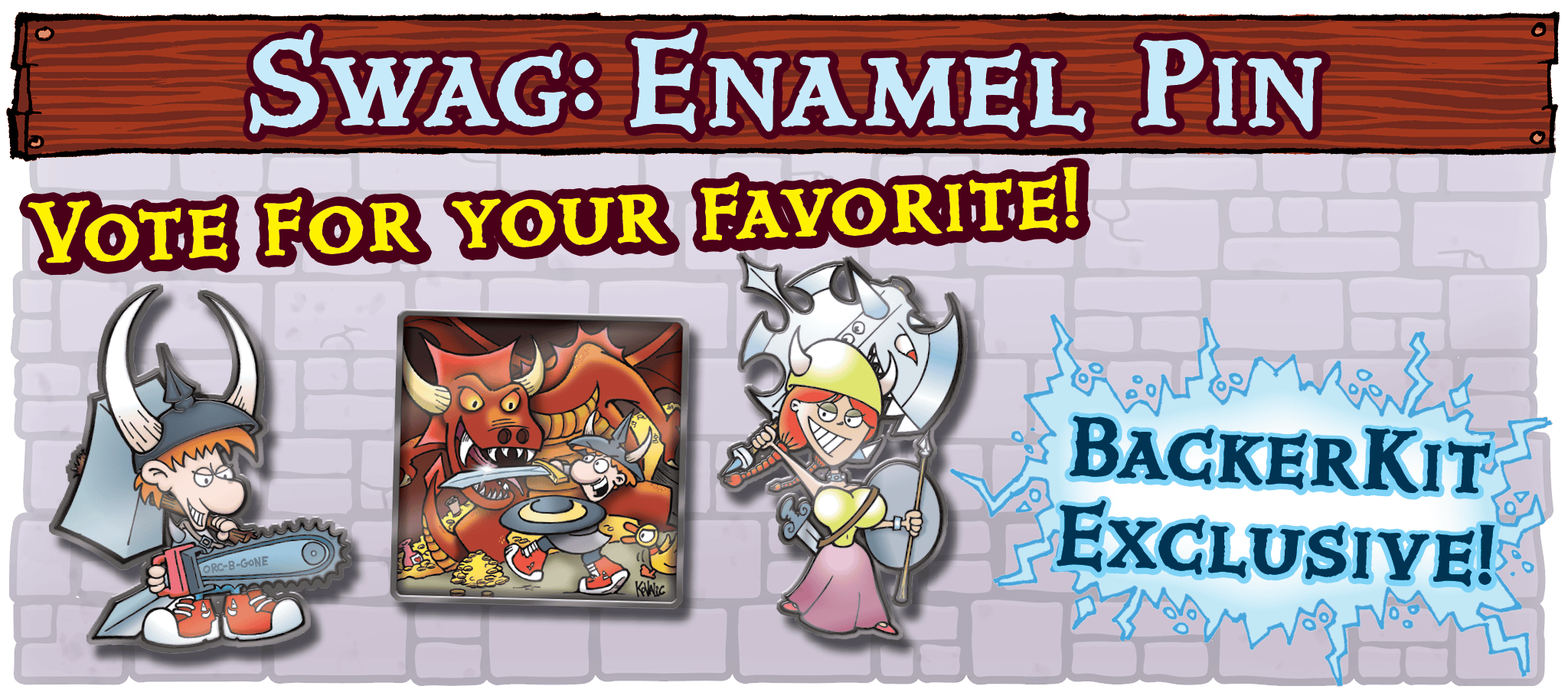 GOAL: $100,000 – Another shiny enamel pin, and you get to vote on the design! Visit the poll in the discussion section (or click the image) to vote for your favorite! This reward is ONLY for Munchkin Big Box backers. It may be available as a campaign add-on, or it may not, but all backers will get it free, and it will not be in the Big Box sold at retail.
