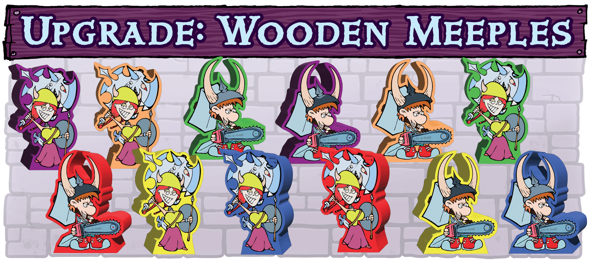 GOAL: $200,000 – If we unlock the improved standies stretch goal, we will upgrade (replace) the standard plastic clip standies in the Big Box to meeples made from wood. These 12 custom meeples will come in six different colors and feature two distinct designs, representing Spyke & Flower! (Images not final!)