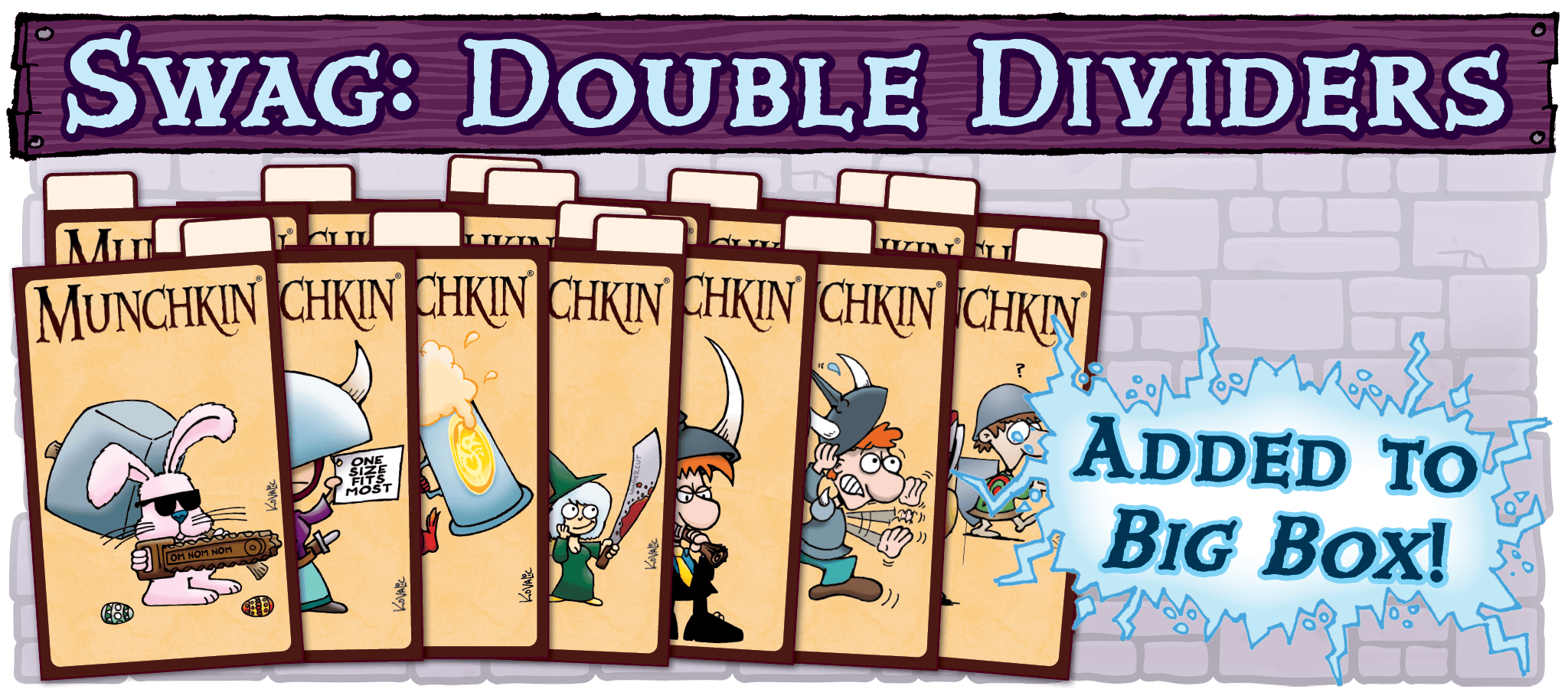GOAL: $700,000 Stretch Goal – Double the Dividers! We've seen your request for more dividers to help organize your Munchkin collection. This stretch goal will double the number of dividers found in the Big Box from 14 to 28. Each divider comes with their own unique art! (Image not final)