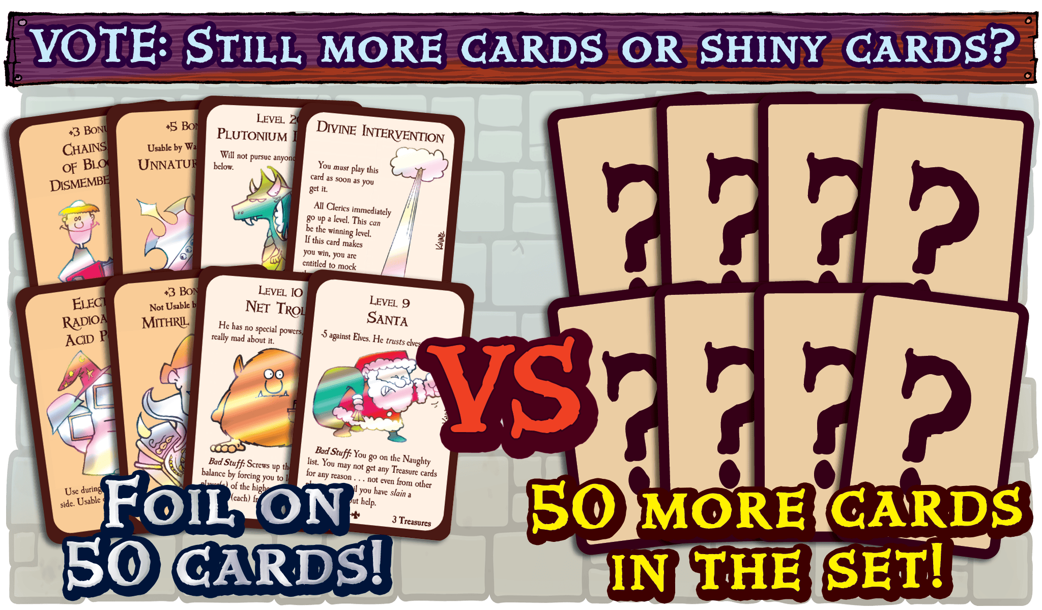 GOAL: $585,000 – The ultimate question for your inner-Munchkin. Will you choose to help everyone and upgrade the retail Munchkin Big Box with 50 MORE great John Kovalic illustrations? Or will you vote to select the reward exclusive to backers, 50 Foil cards? The 50 cards selected to be foiled will be duplicates of cards already found in the Big Box. Click here to vote!