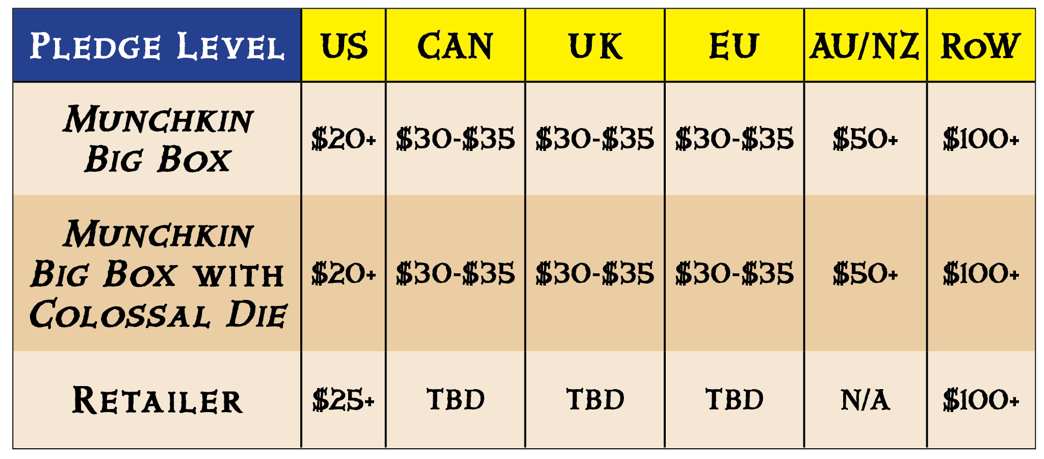 Drop by the campaign Add-Ons section to check out all the great sets that John has contributed to. After the project closes, we will open the pledge manager. There you will provide the necessary information to fulfill your pledge items, and you may select additional items to add to your pledge. If you don't see what you're looking for in the campaign add-on section, that doesn't mean it won't show up in the pledge manager! When the survey is released, our add-on store will be packed full of games and accessories for Munchkin! The final shipping total will be calculated by the total weight of your pledge and any add-on items. Please see the shipping table for base costs.