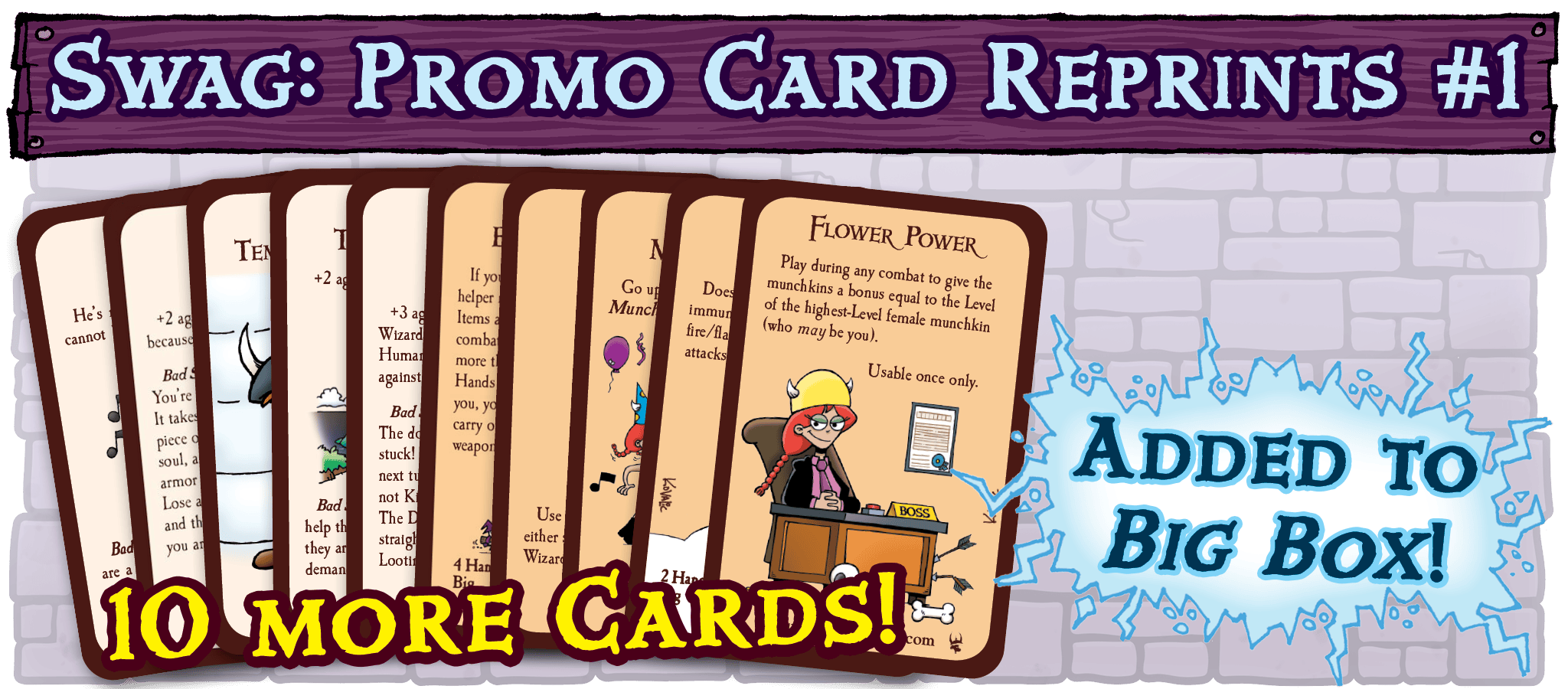 GOAL: $110,000 – The Munchkin team hand-picked 10 of their favorite promo cards. We’ll add these 10 favorites promo cards to all Big Box sets, even those sold afterwards at retail stores.