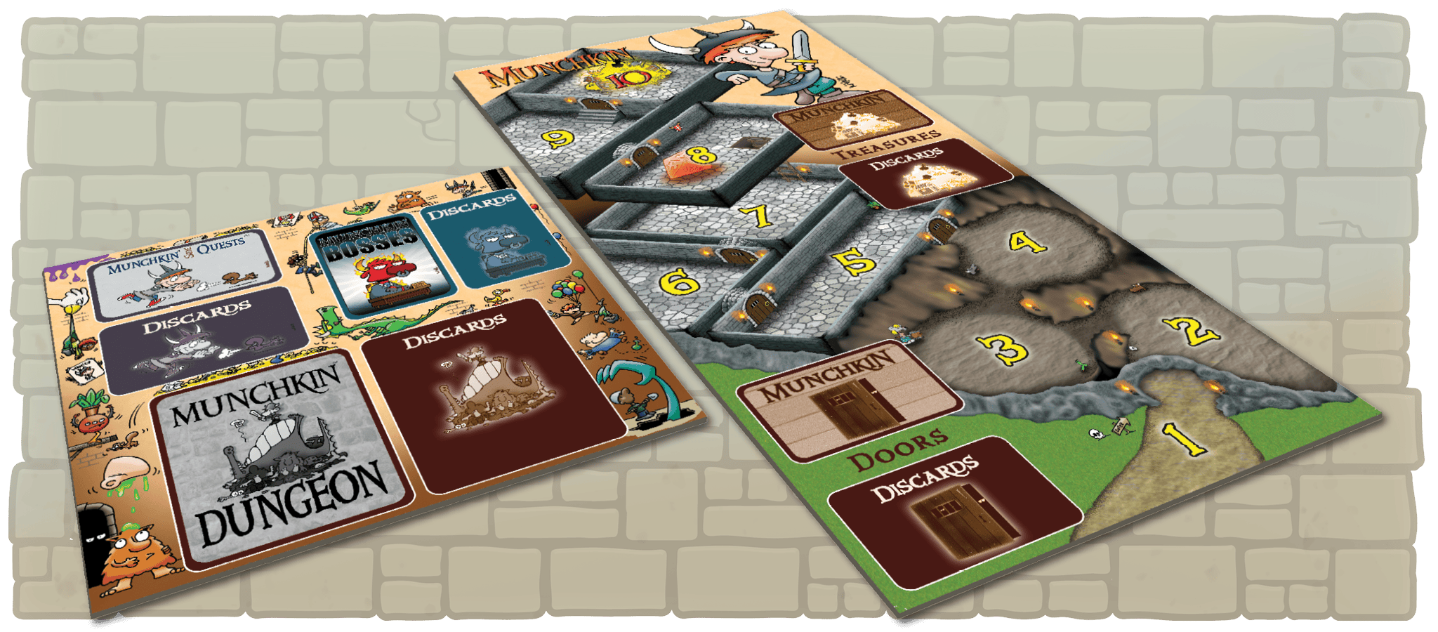 There are two gameboards. One is the level-counting board that you know and love, with a new illustration by John Kovalic. The other is a "sideboard" for use with the Dungeon and Side Quest expansions to keep those cards organized.