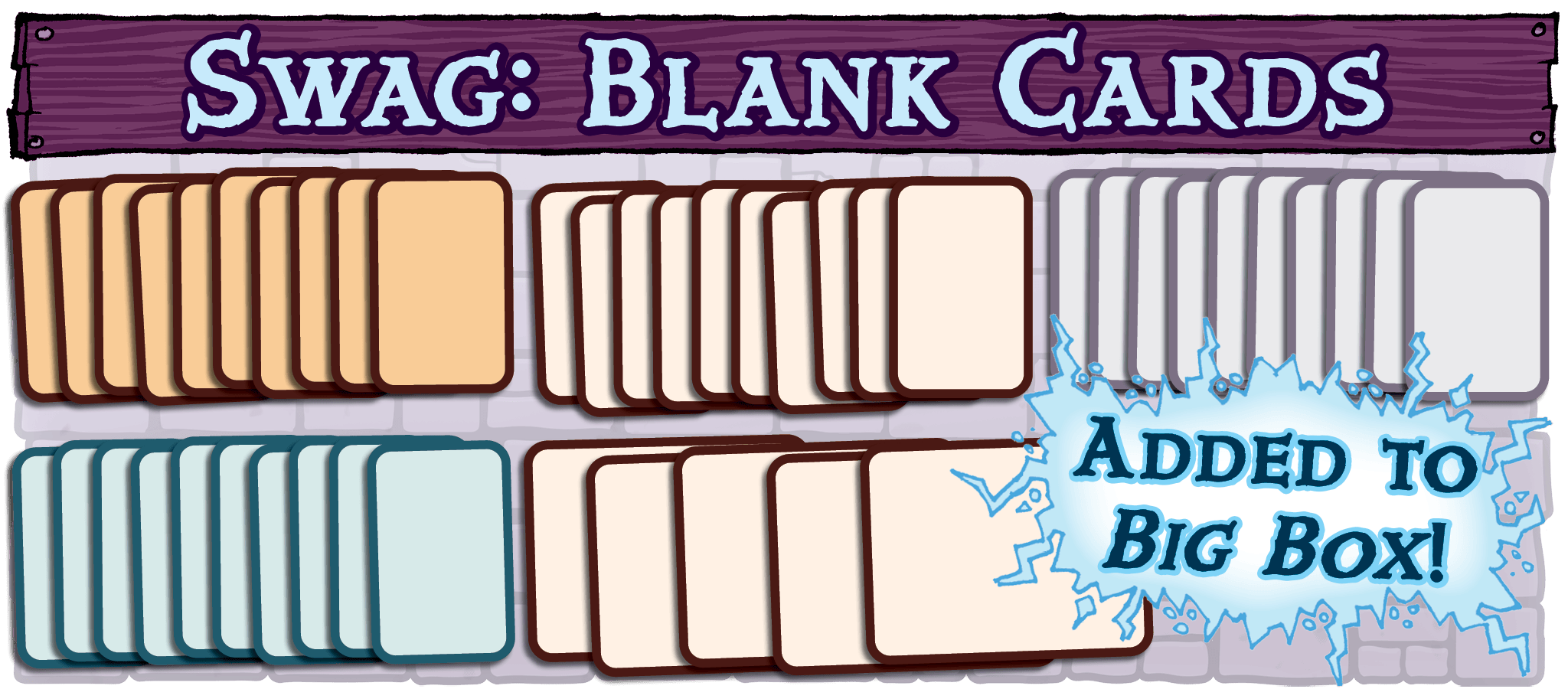 GOAL: $320,000 – Replacing the former 25mm dice stretch goal will be 45 Blank Munchkin Cards. This pack will include 10 Treasures, 10 Doors, 5 Dungeons, 10 Bosses, and 10 Side Quests blanks. We will be adding them to every Munchkin Big Box, including those that go into retail stores.