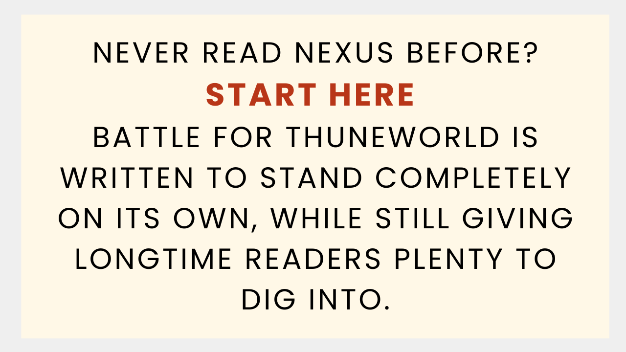 This is Nexus: The Battle for Thuneworld, a 324-page oversized hardcover art book at 12 × 17 inches (30 × 43 cm), nearly as large as a newspaper page.
