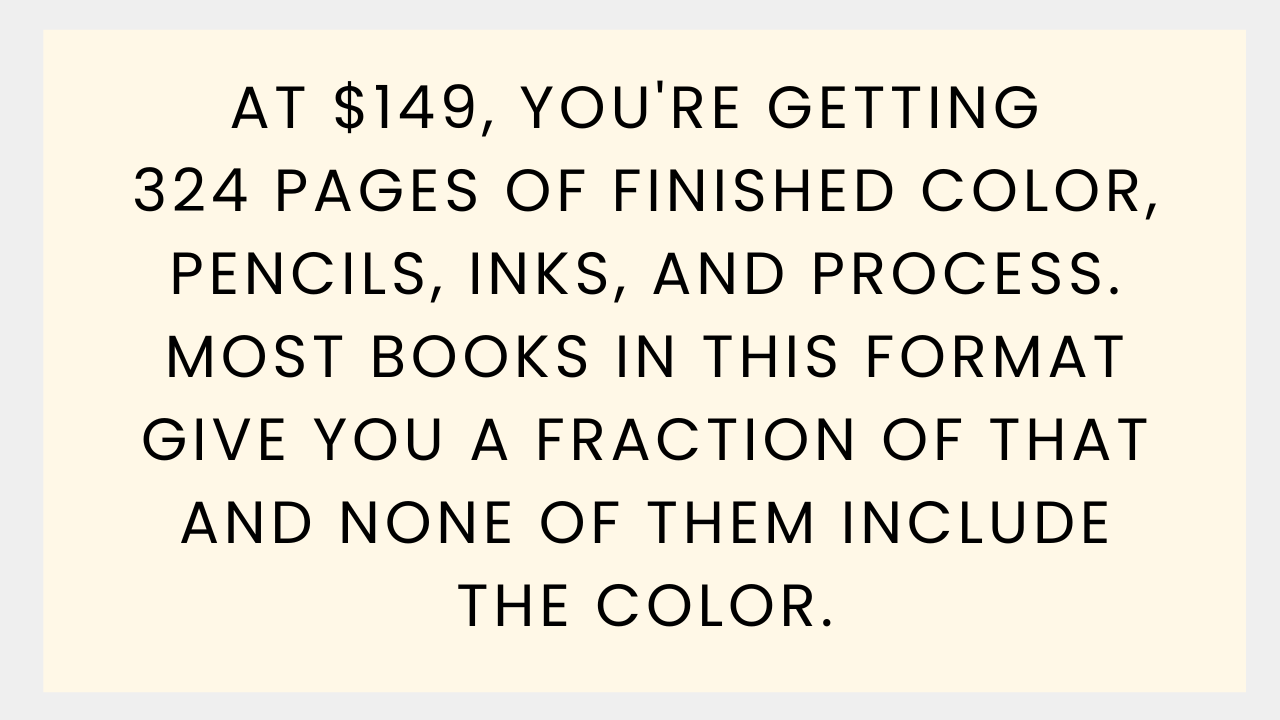 At $149, you're getting 324 pages of finished color, pencils, inks, and process. Most oversized editions in this format run around 124 pages of black and white at the same price or higher.