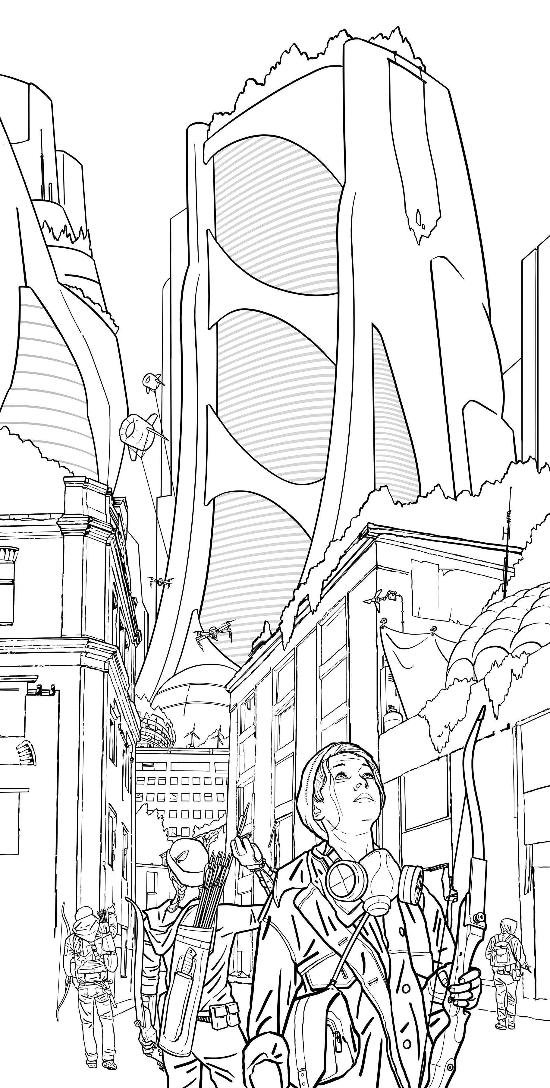 Rob has been working HARD on a new and very important art scene for the book. In this image, a crew is discovering a Situation in an abandoned city... Upon arrival, Guiding Hand drones descend from the sky and alert any local White Fist thugs to their location! As you can already see, this highly detailed scene is going to look absolutely GORGEOUS when finished, and we cannot wait to share it with you! Everyone give our illustrator Rob Ingle a round of applause for having the patience to not only translate our ideas into beautiful works of art, but also for having the patience to do such detailed line art! 👏👏👏