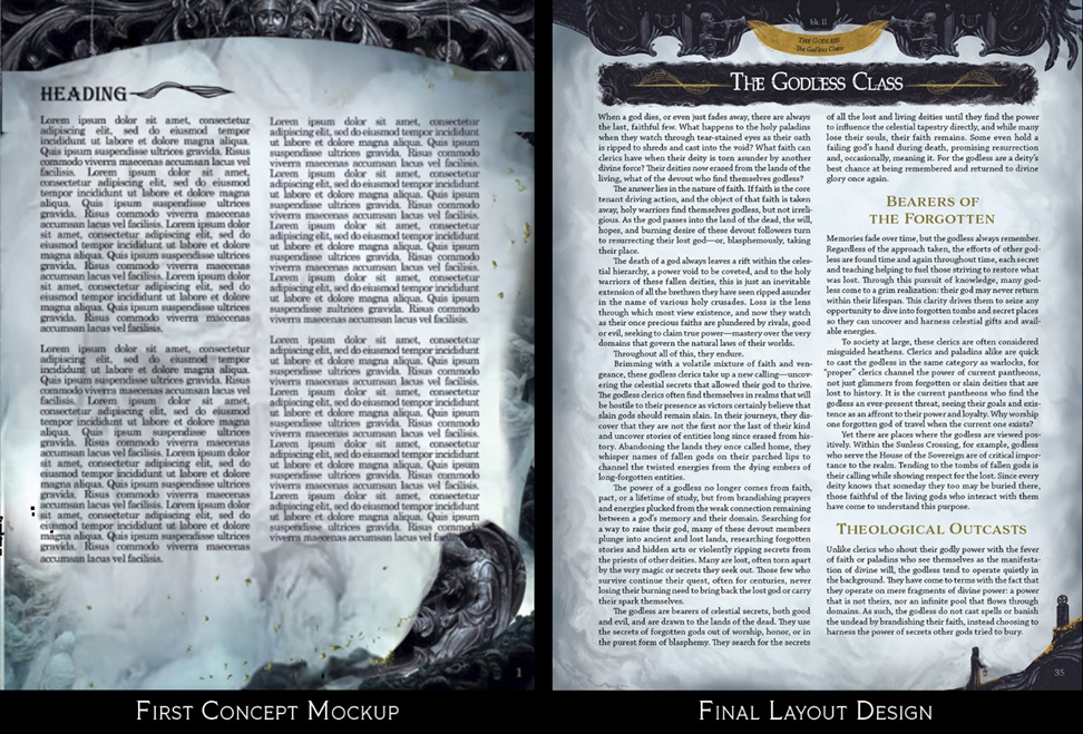The mockup process involves a mix of photo bashing and painting to get a “feel” for the idea. I take references that I’ve saved over time in the mood board, paste them into a photoshop mockup with some text, then cut and mold into multiple different iterations until something starts to take shape. The images used in the mockup stage are NOT used in the final. Everything is reference only and the final assets are always painted from scratch.