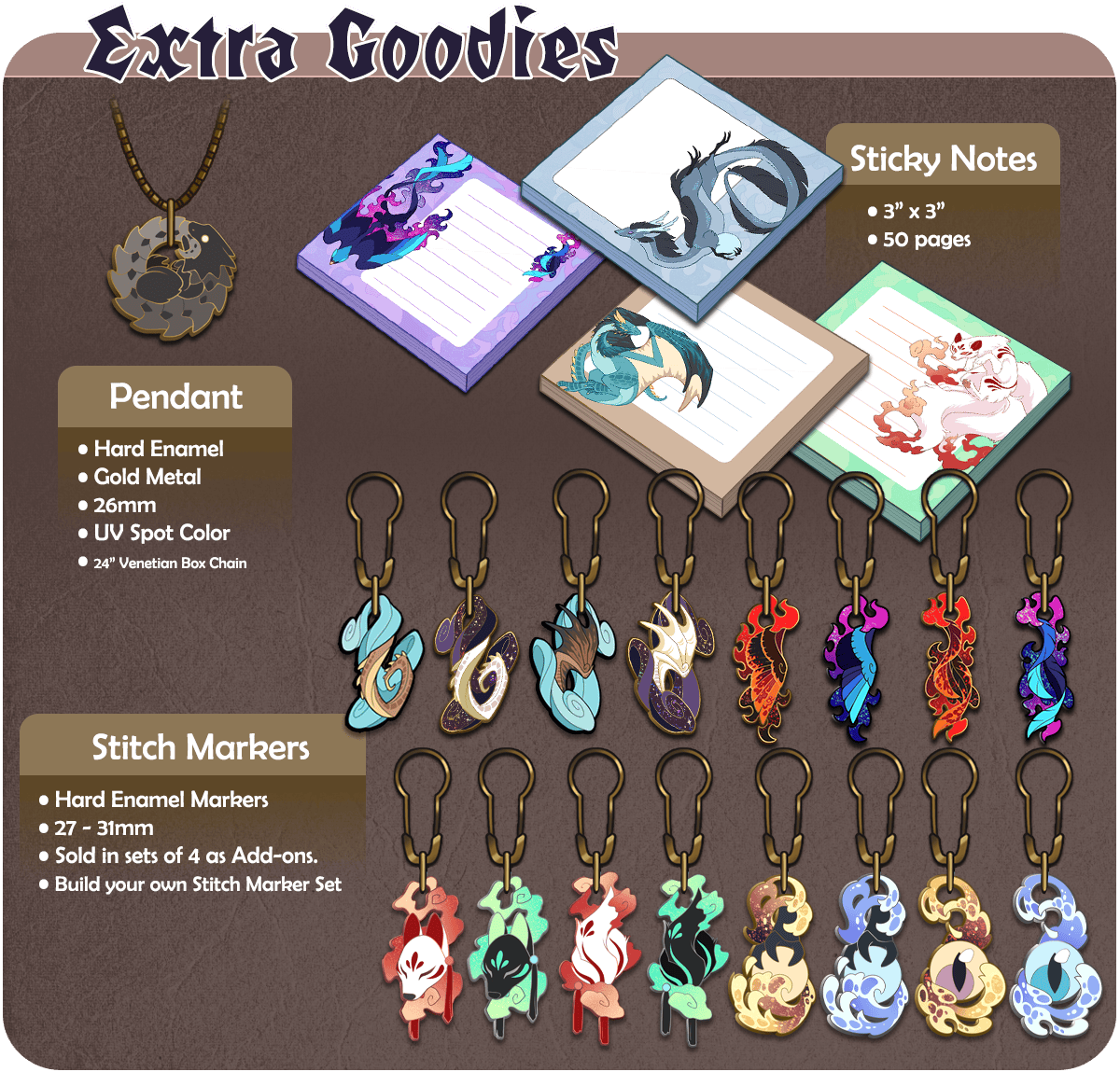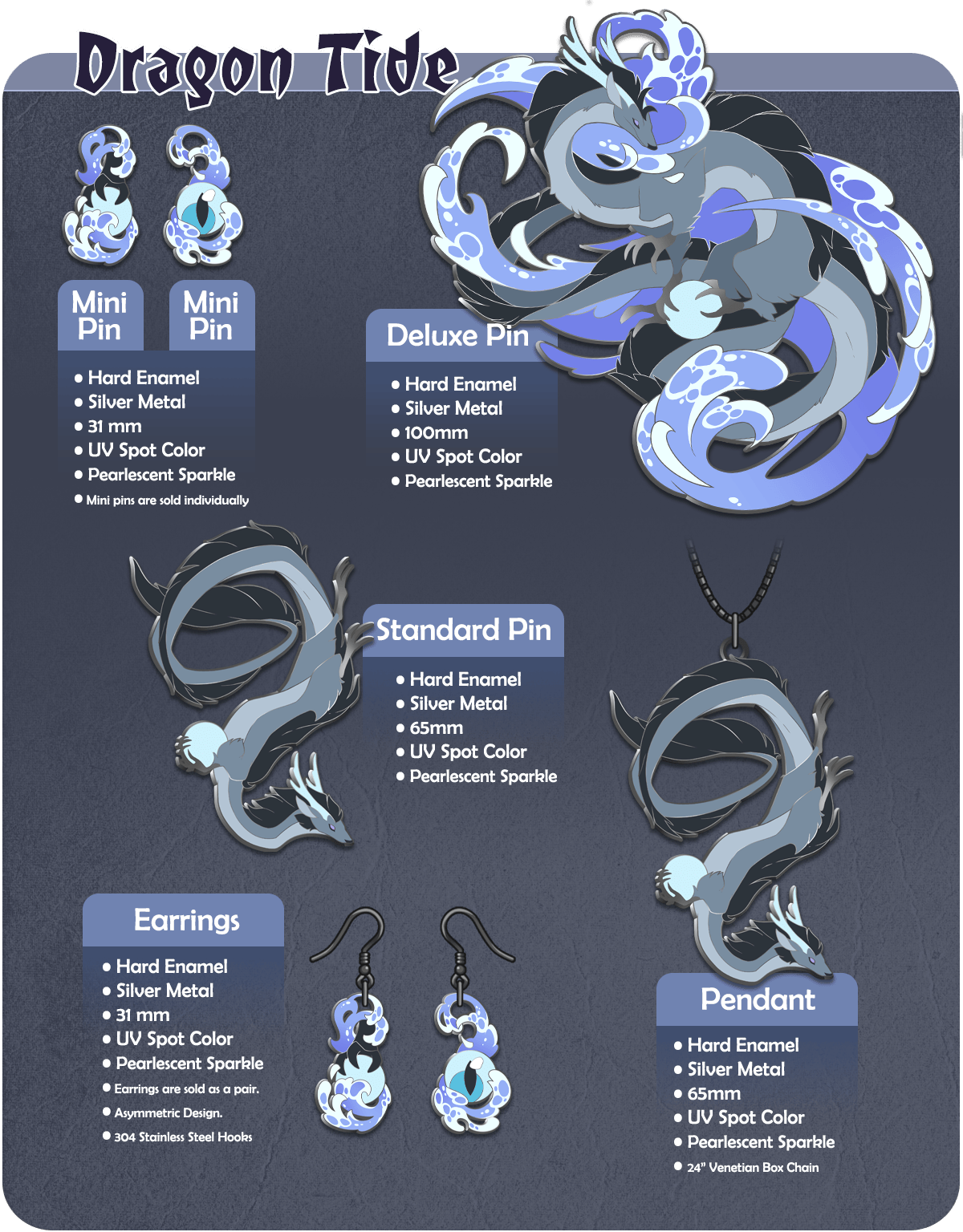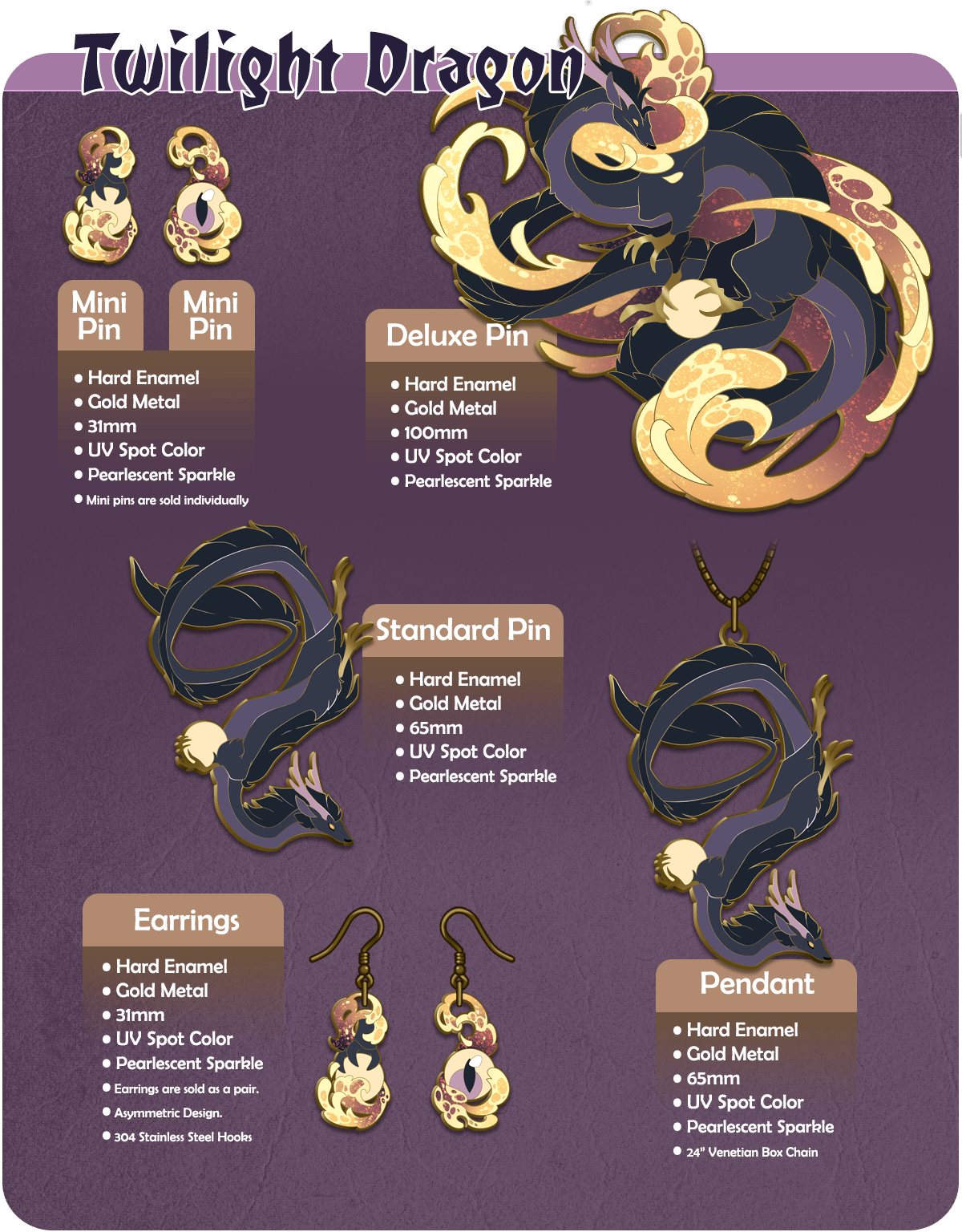 This series of pins consists of several themed sets. Each set will have one large, deluxe pin featuring a full-body mythical creature surrounded by elemental energy, a standard sized pin of the mythic creature, mini pins with complimentary elemental decoration, a pair of earrings, and a pendant necklace. Our initial funding goal will allow the production of the Wyvern Wind and Phoenix Fire pin set, with the possibility of unlocking additional elemental creature sets if certain stretch goal funding thresholds are met!