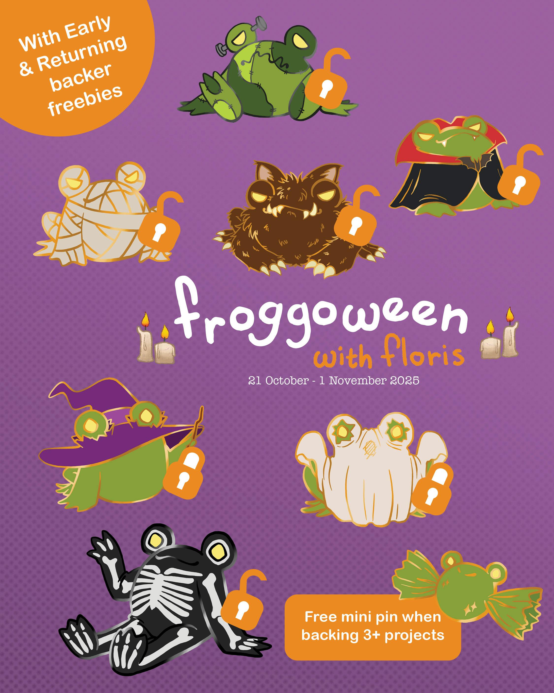 Froggoween has unlocked 5 of 7 enamel pins, Floris the Frog will have enough costumes to go trick or treating with. Let's see if we can add the Ghost and the Witch as well. We're very close to the Ghost already so I think that will happen soon!