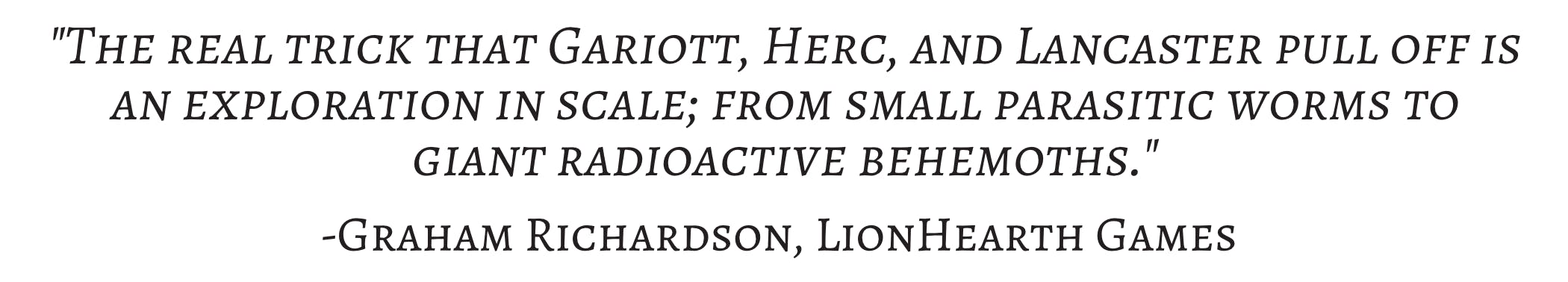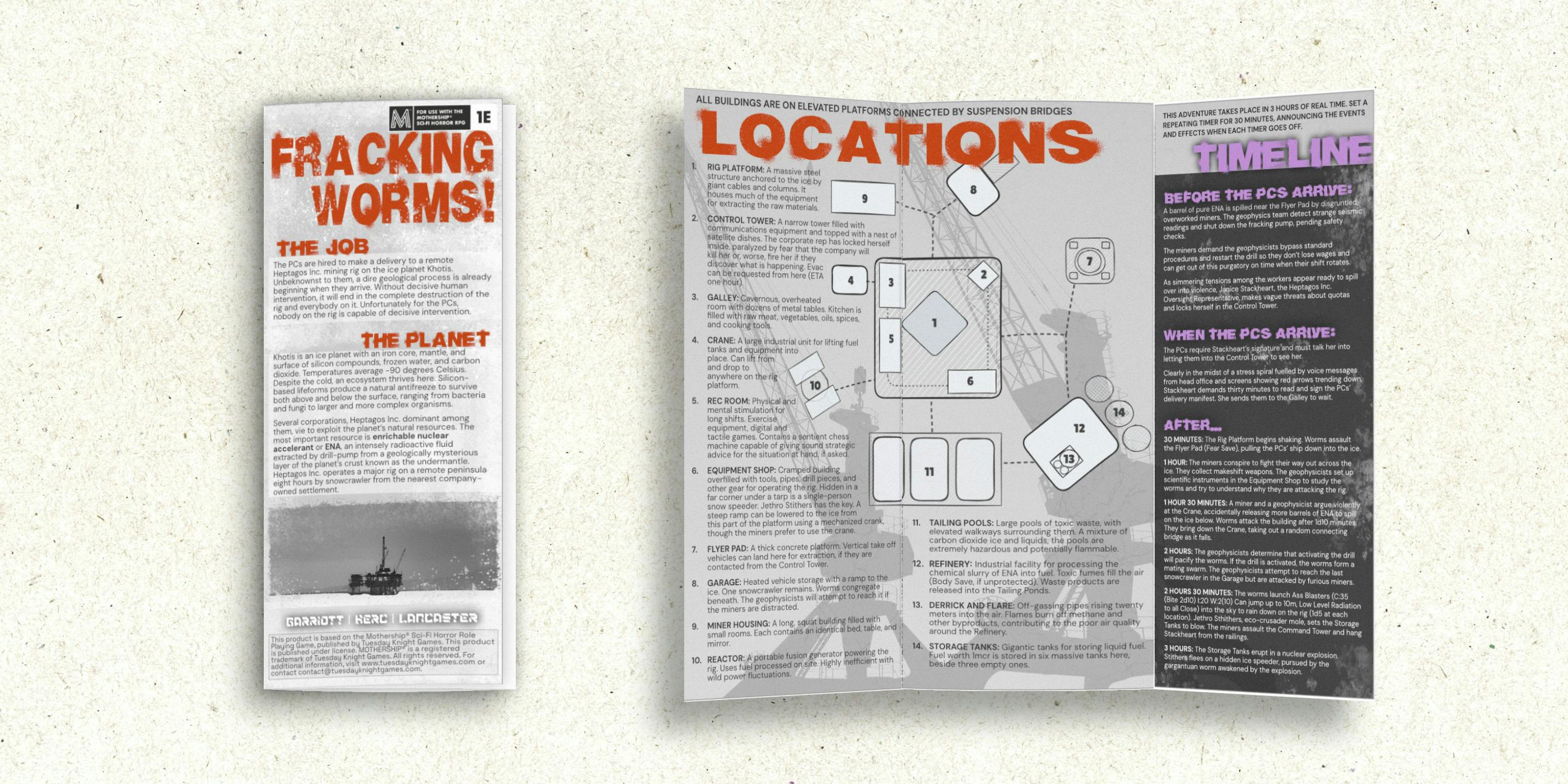 by Scott Garriott, Clive Lancaster, and Terry Herc A corporate ice-rig shakes apart as radioactive worms swarm the site, drawn by drilling deep into something vast beneath the planet’s crust. Workers riot, eco-saboteurs stir chaos, and flying larvae rain from the sky. You’ve got three hours before it all blows.