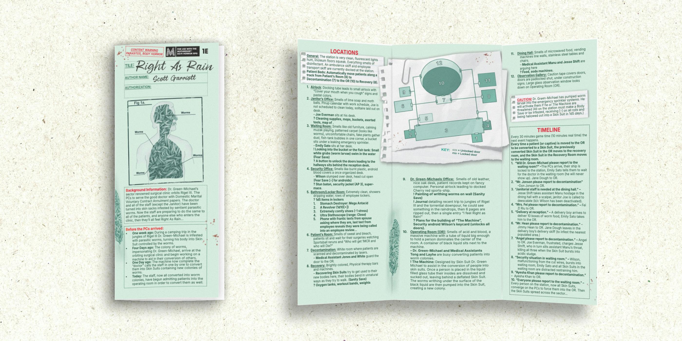 Deliver divorce papers at a luxury orbital clinic, only to find the staff are hollow skins filled with writhing worms. Patients are next on the table. Can you escape before everyone is made “Right As Rain”?
