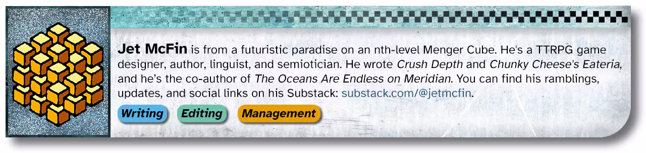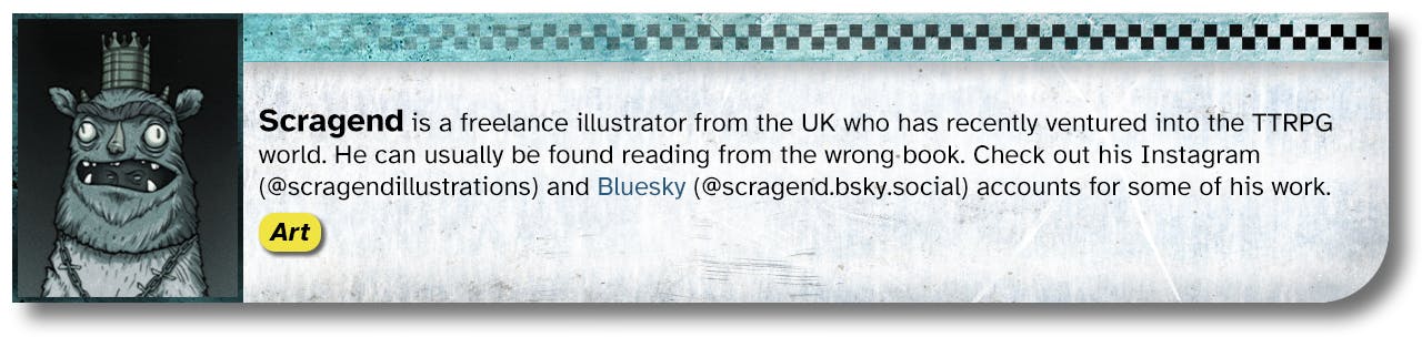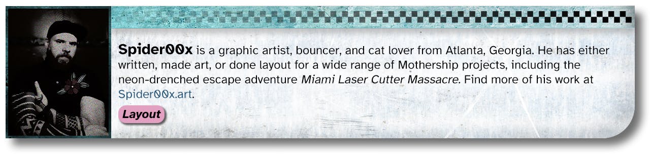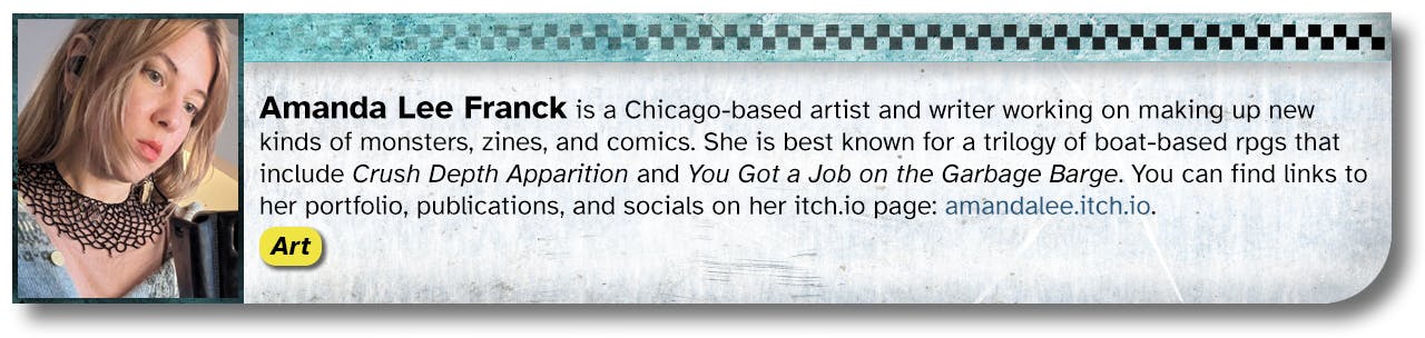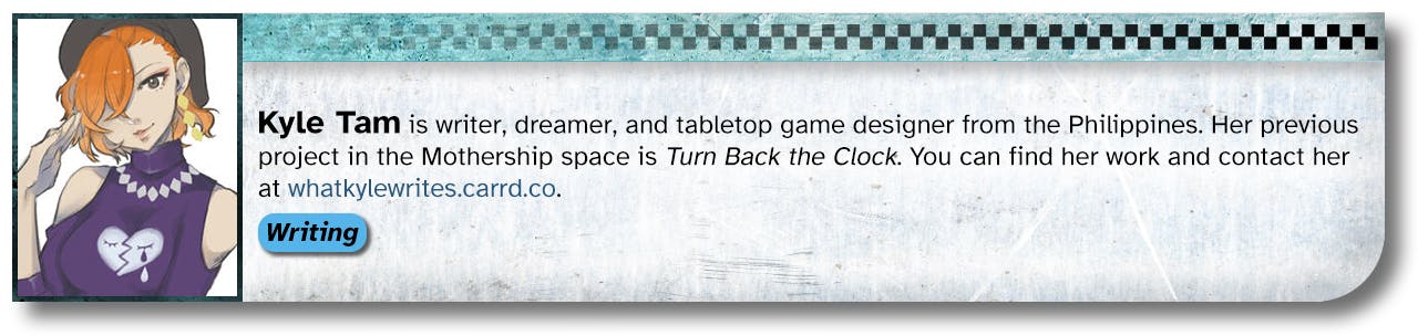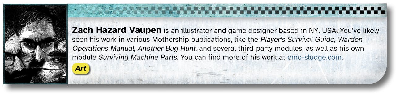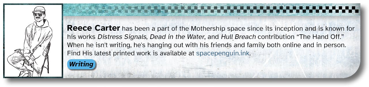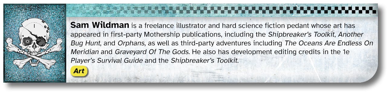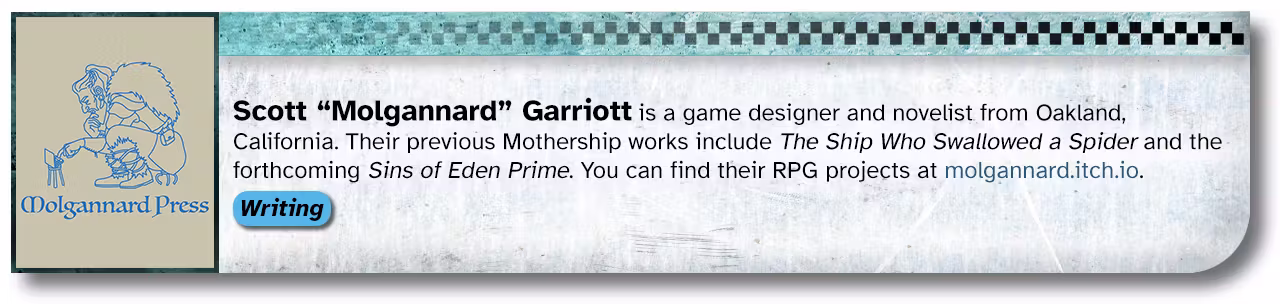When the idea of funding a bunch of new books and zines for Mothership Month was first pitched, Reece Carter (Scarius on the Mothership Discord) had the idea of a big collaborative book about space piracy and asked who might be interested in working together. After dozens of responses, six months, and a Discord server full of messages, we had a draft and some compelling art.