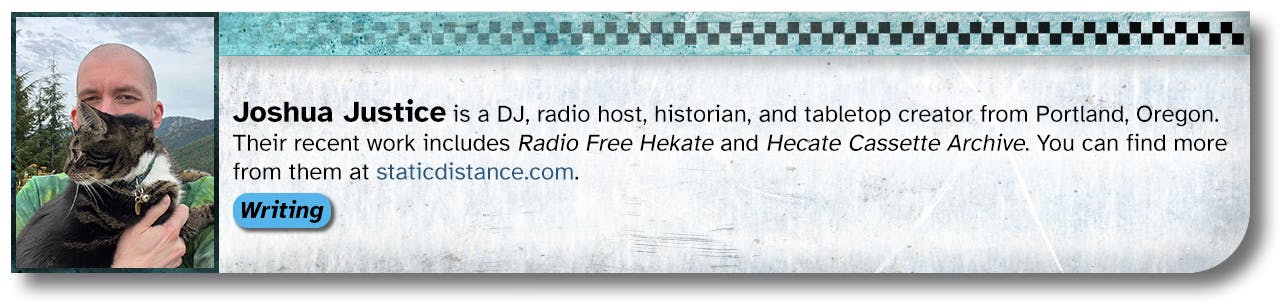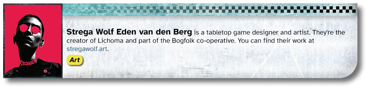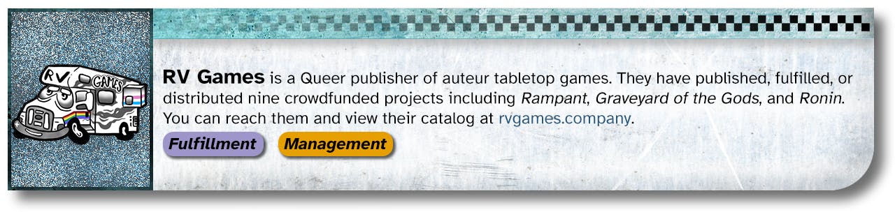 Add-ons from RV Games and others will be available via the Pledge Manager. Shipping is included in the pledge level cost for zines and pamphlets purchased as add-ons, but books and larger items will have a per-item shipping cost added. Items that include dice will be charged a 25% fee on top of the item price when being shipped to the UK.