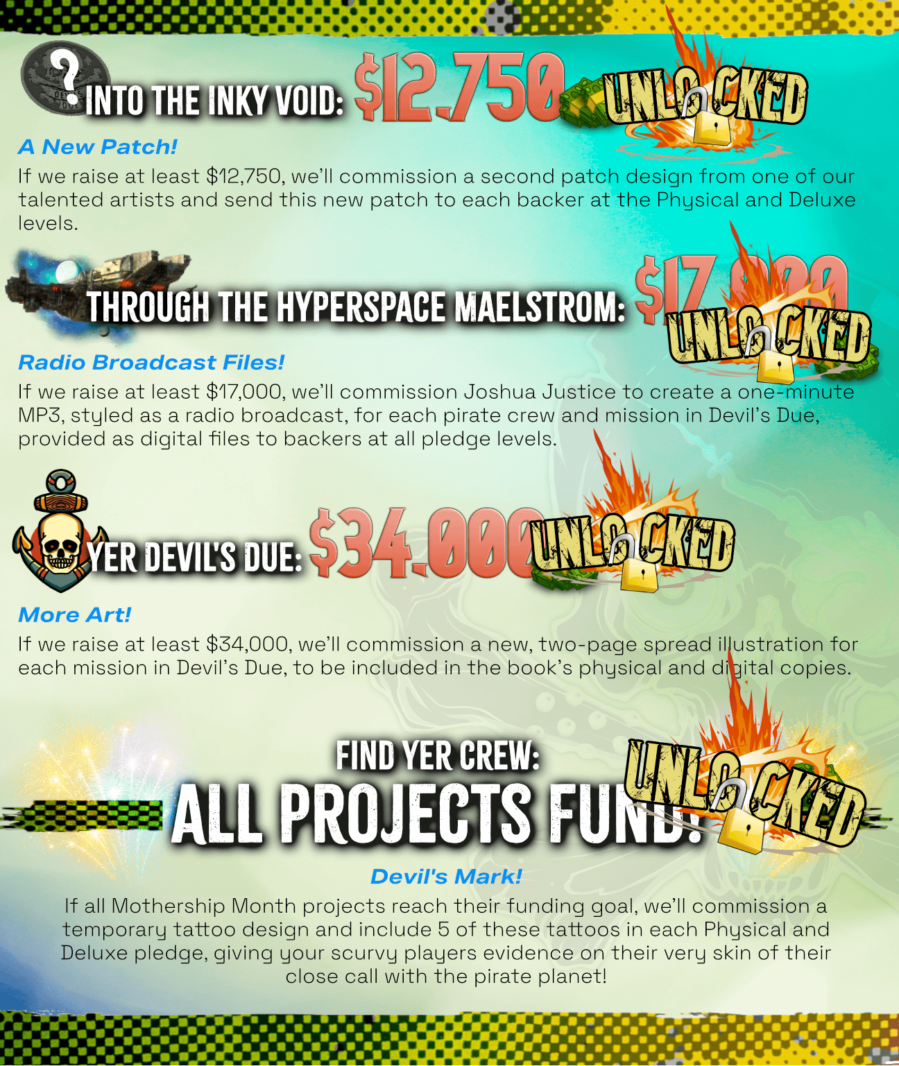 All in: if you back 5+ projects you're getting 4 Character Card packs (an entire deck of cards), 21 foil project stickers, an exclusive Mothership Month 24 pin, and a brand new adventure pamphlet.