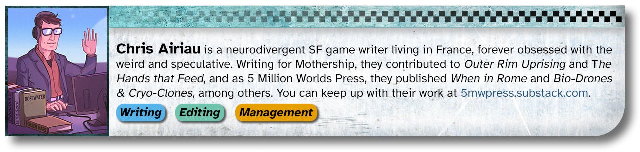 Brace yourself for Mothership Month—a group-collab project led by Tuesday Knight Games featuring some of the brightest stars from the Mothership third-party publishing (3PP) community. Each 👩🚀 creator has launched a brand new adventure filled with criminals, smugglers, and rimspace pirates.