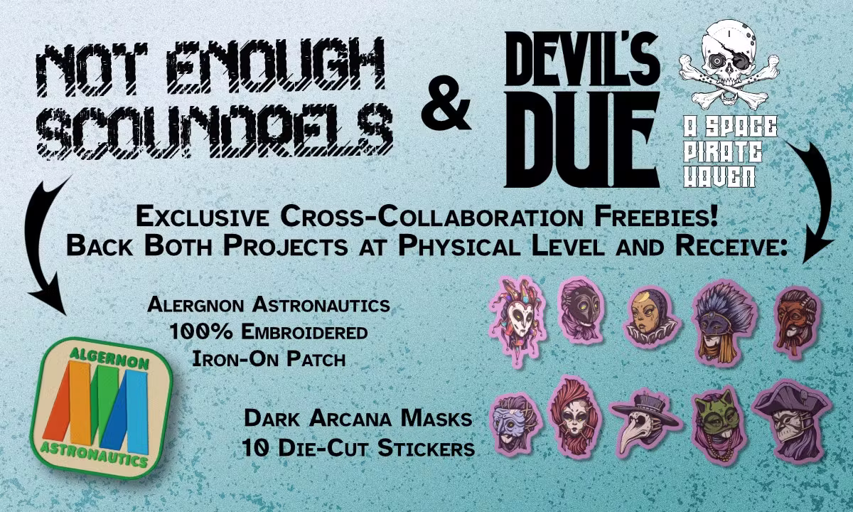 We’re getting in on the BackerKit Cross-Collab fun this Mothership Month by partnering with another project from one of our many contributors: Chris Airiau’s Not Enough Scoundrels from 5 Million Worlds Press. Backing bothDevil’s Due and Not Enough Scoundrels at any physical pledge level will get you another patch from 5MW Press and 10 stickers from us!