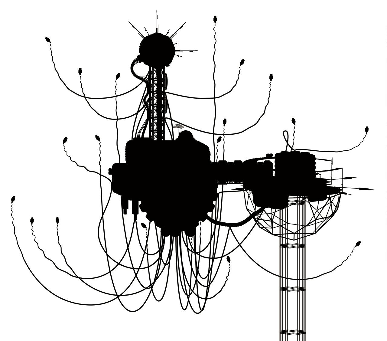 The scrappy city of Azimuth and Flotsam Station above it, anchored to the stars by the space elevator Charon’s Ferry, including: