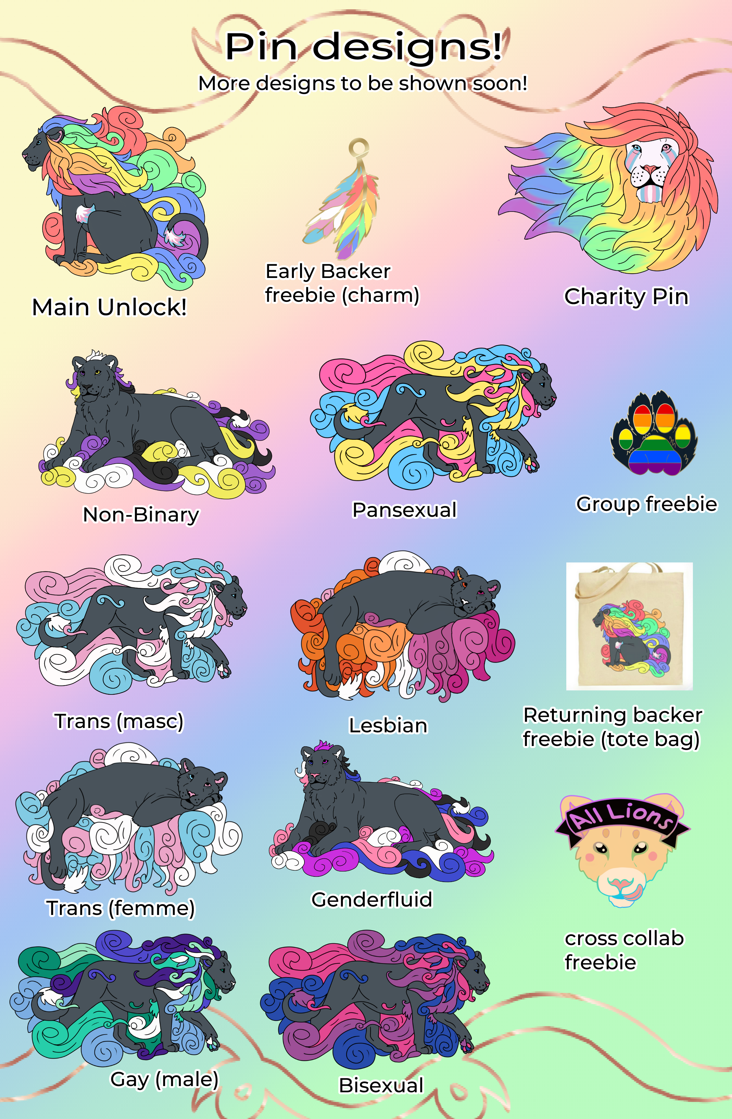 There will be a range of lions with pride colored features! This will include: LGBT+ (main design featured in banner) Charity pin (the lion face) -£5 of each sale (of this pin) goes to the Trevor Project. Enby and genderfluid Bisexual and pansexual gay(male) and lesbian ????