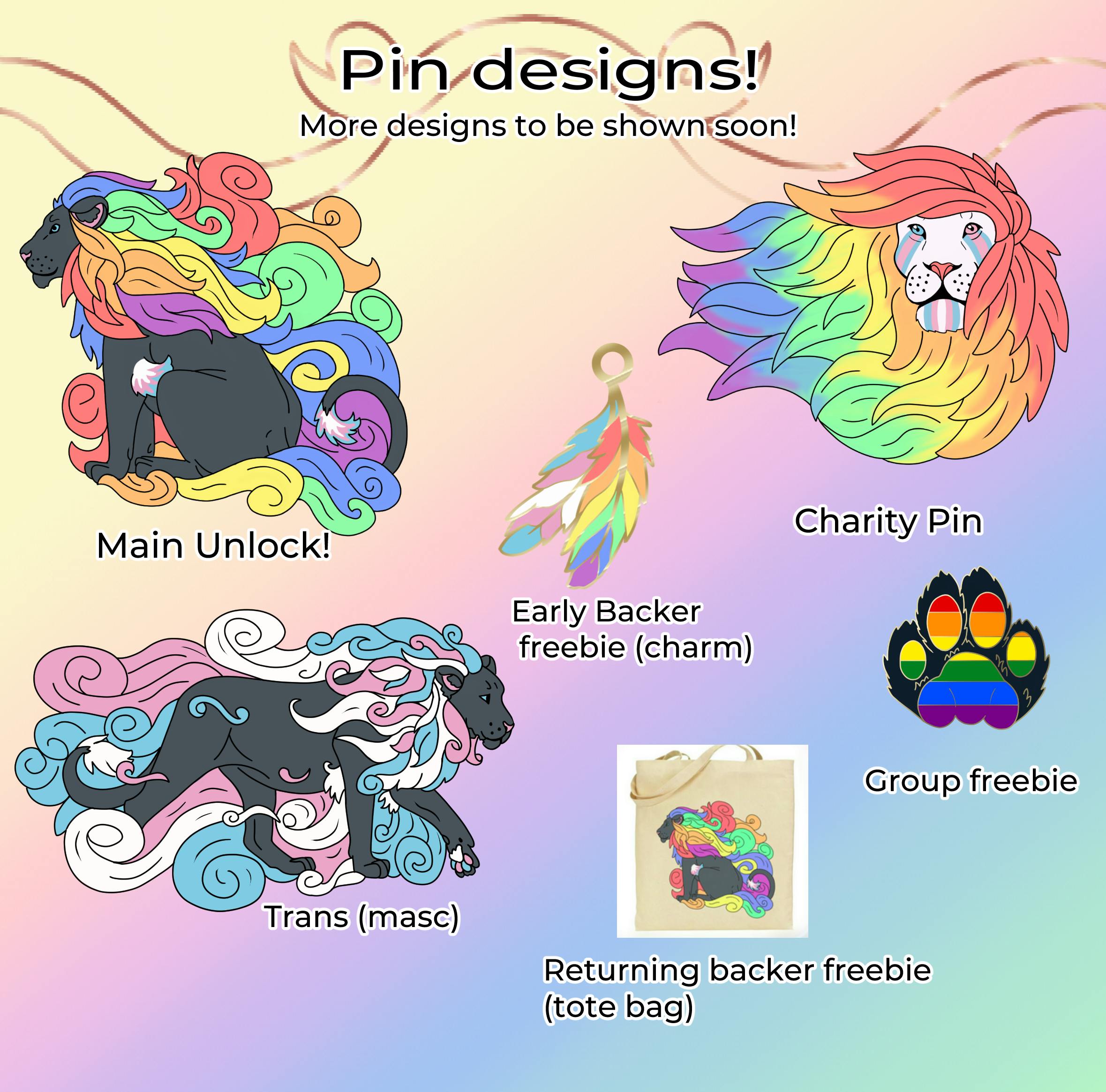 There will also be FREE goodies for those who back! -Early backer freebie -feather charm! -group freebie -back 3+ projects in the 'pin of pride' event to get a free mini pin from each project you back! (ours will be the paw featured in the banner!) -cross colab freebies -back this project and 'lions pride' to get two free pins! -retuning backer freebie (canvas tote bag)