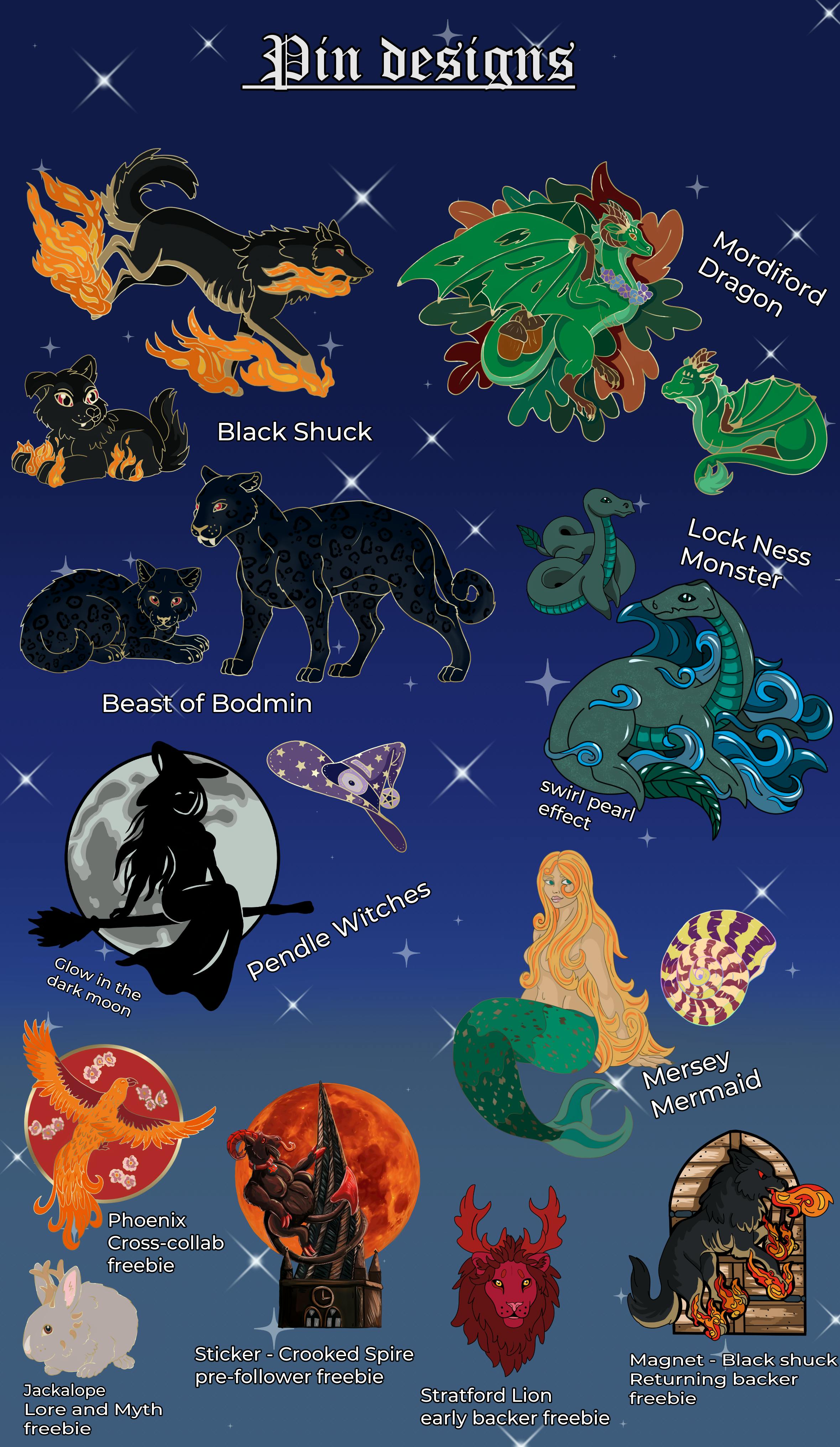 A collection of mythological creature pins!