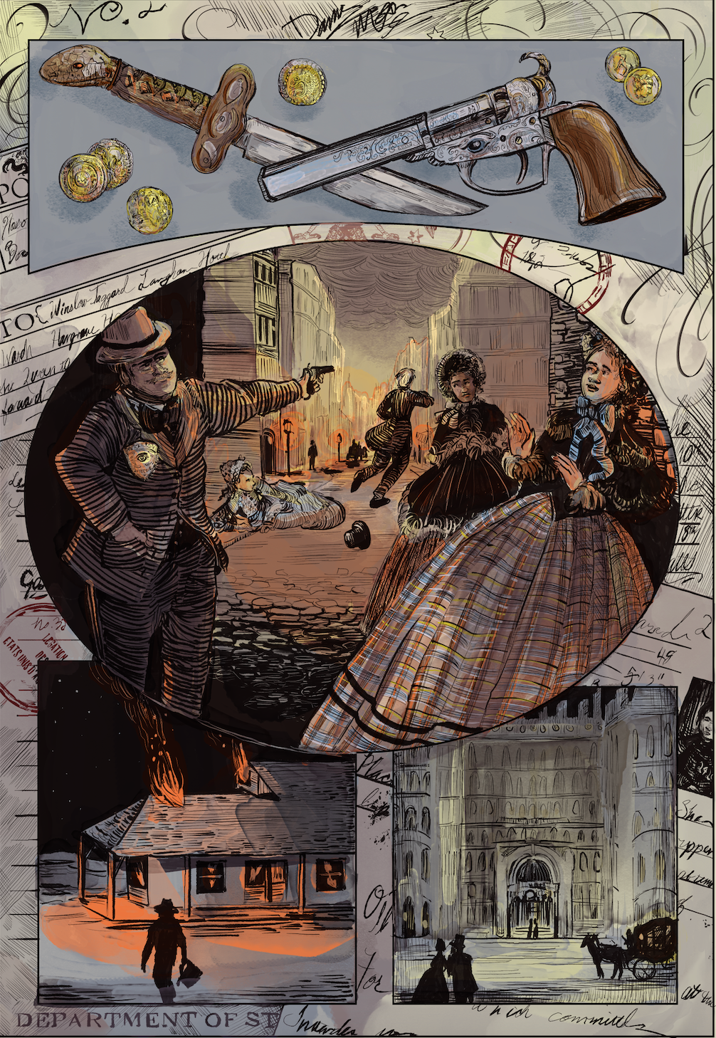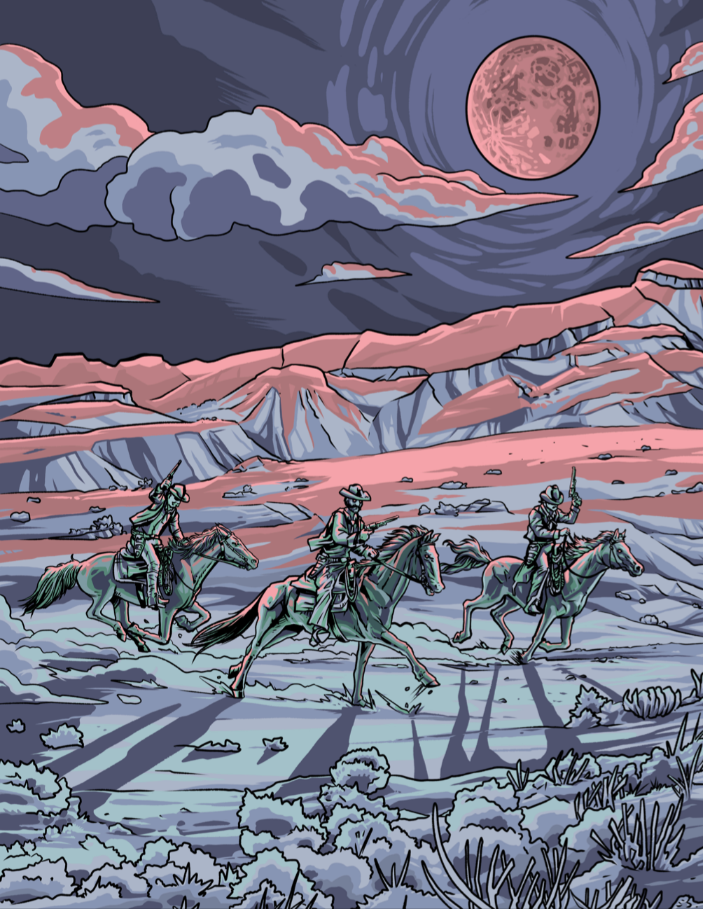 Ghosts of El Paso is about a group of ghost hunters—the Vigilance Committee—in the township of El Paso, Texas in the late 19th century, after the War but before the first railroad came through. The Vigilance Committee is dealing with the effects of the Wounded Night, a seasonal phenomenon in El Paso that takes place in the Fall every six years, during which time the veil between the Land of the Living and the Land of the Dead is thinned. The hunters learn about various ghostly threats around El Paso and conduct investigations in order to neutralize them. Over time, they become aware of the plans of a criminal mastermind who is pulling the strings behind the scenes. The hunters will eventually be forced to confront this mastermind in order to save their community. The Between: Ghosts of El Paso is inspired by Western films and TV shows such as Deadwood, The Ballad of Buster Scruggs, The Quick and the Dead, and Unforgiven. It also takes inspiration from Texas folklore and urban legends, as well as the music of Johnny Cash and other artists.