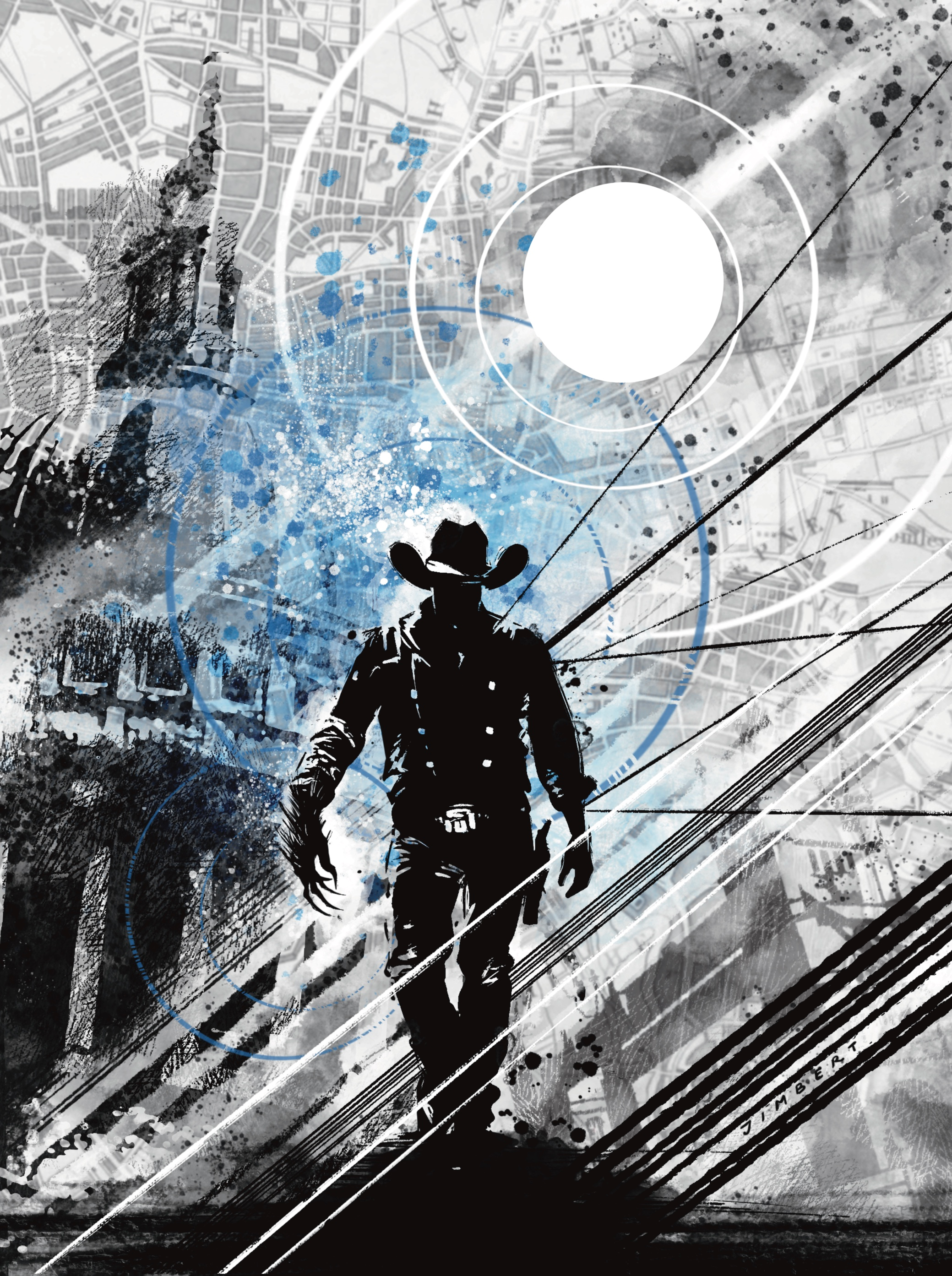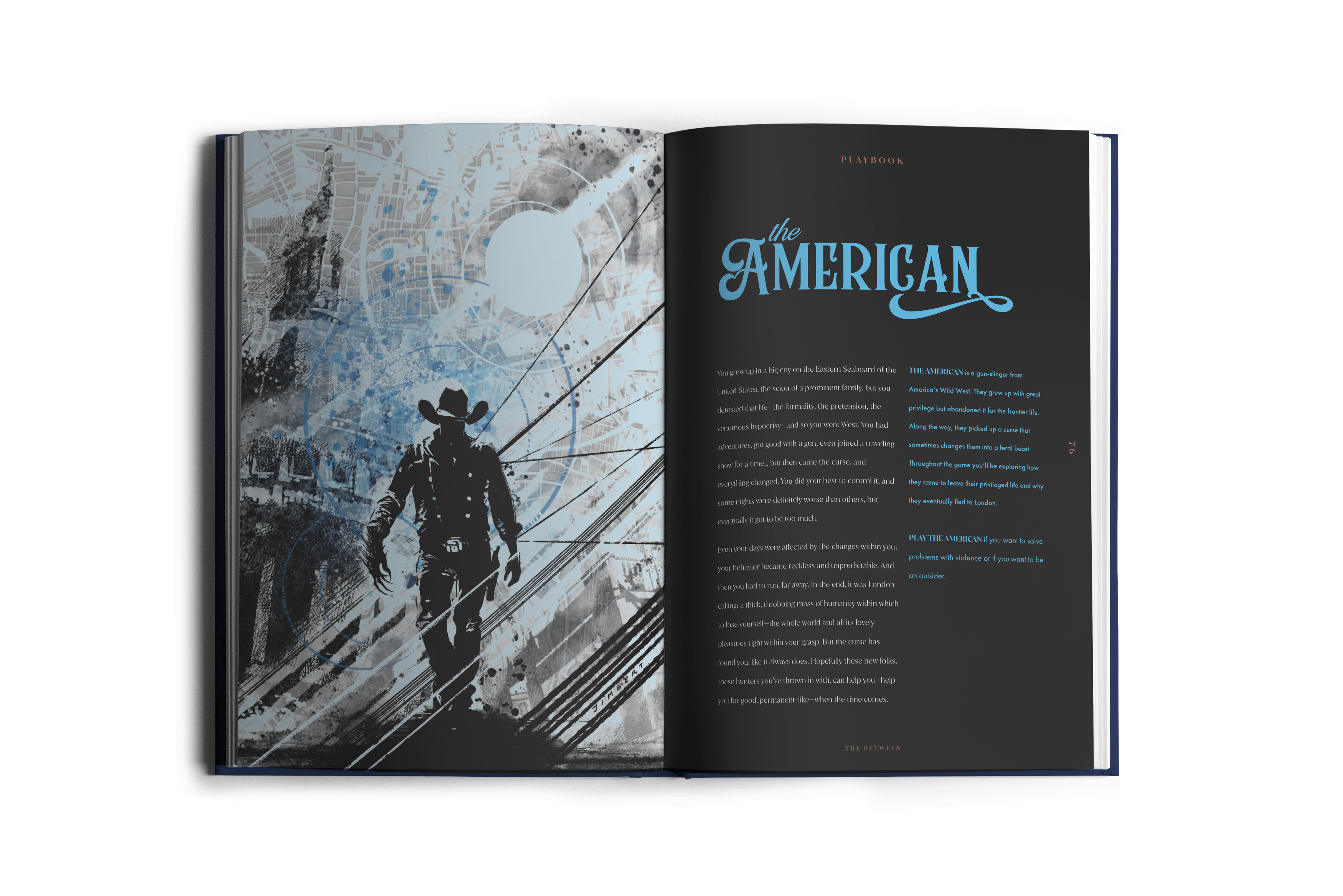 Art for each playbook will be presented in a "dark silhouette" style, capturing the "between" state each hunter finds themselves in—between a mysterious past and a dark future, between pain and redemption, between dark and light. Here, the American walks the streets of London, barely able to keep their feral nature in check, hoping against hope to avoid hurting another innocent.