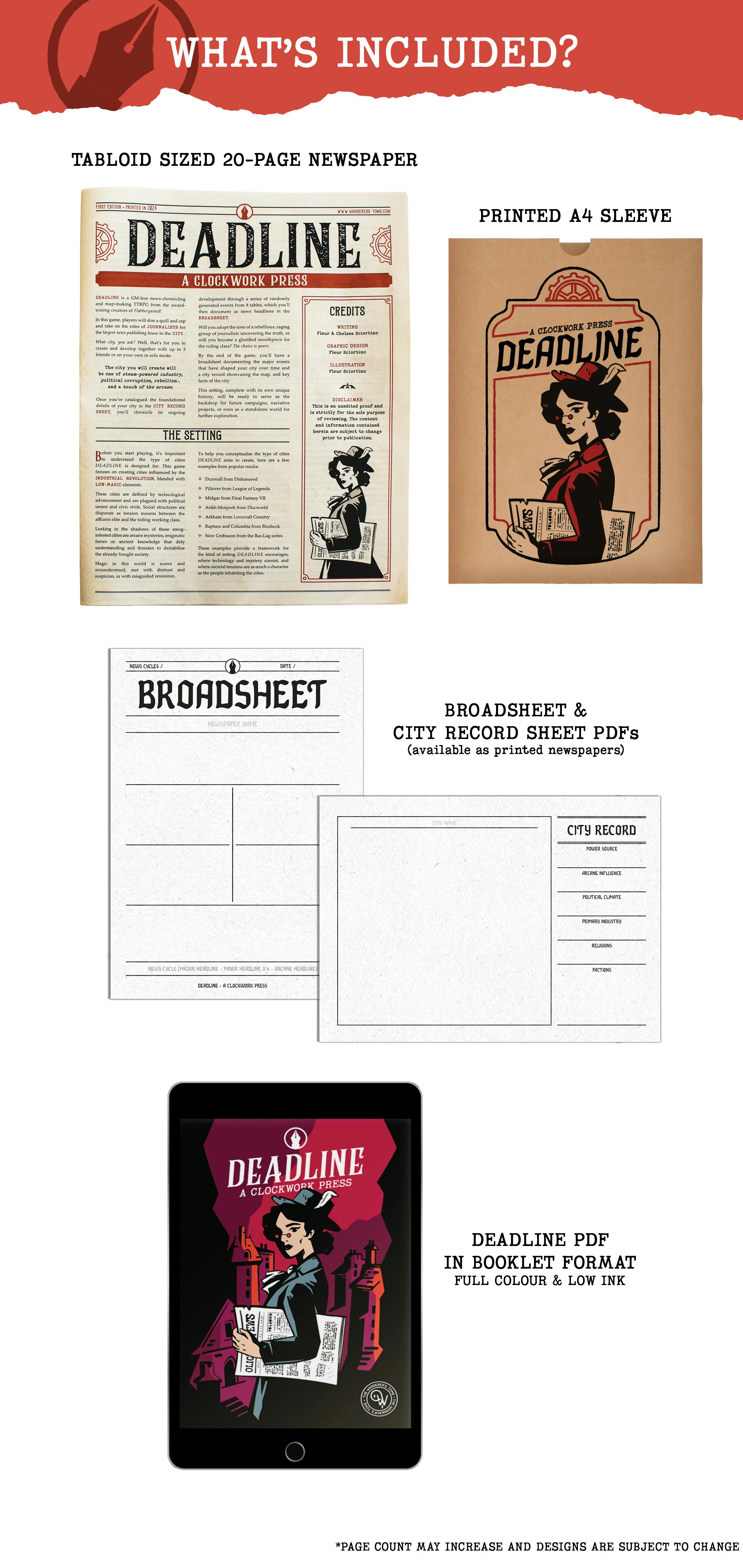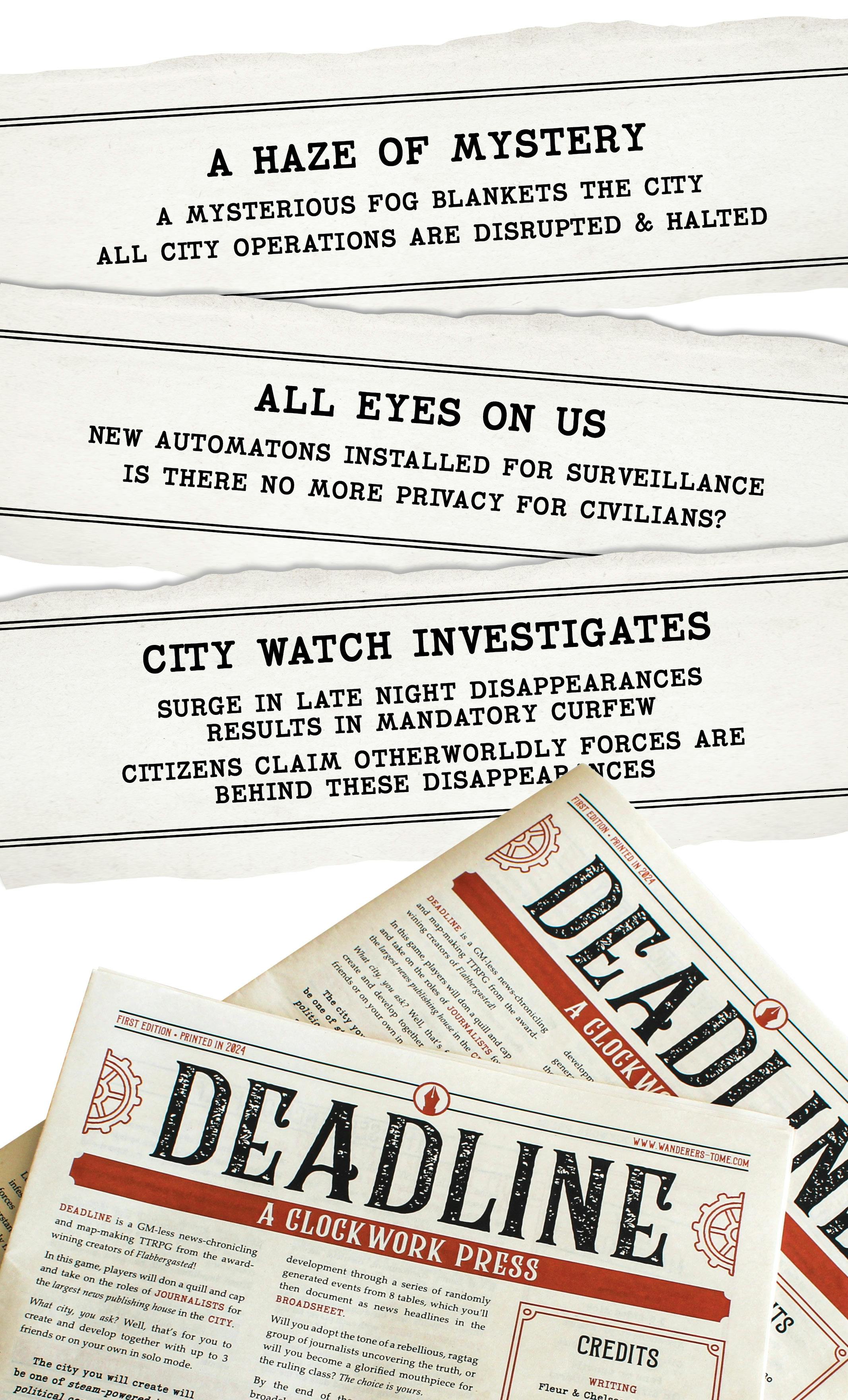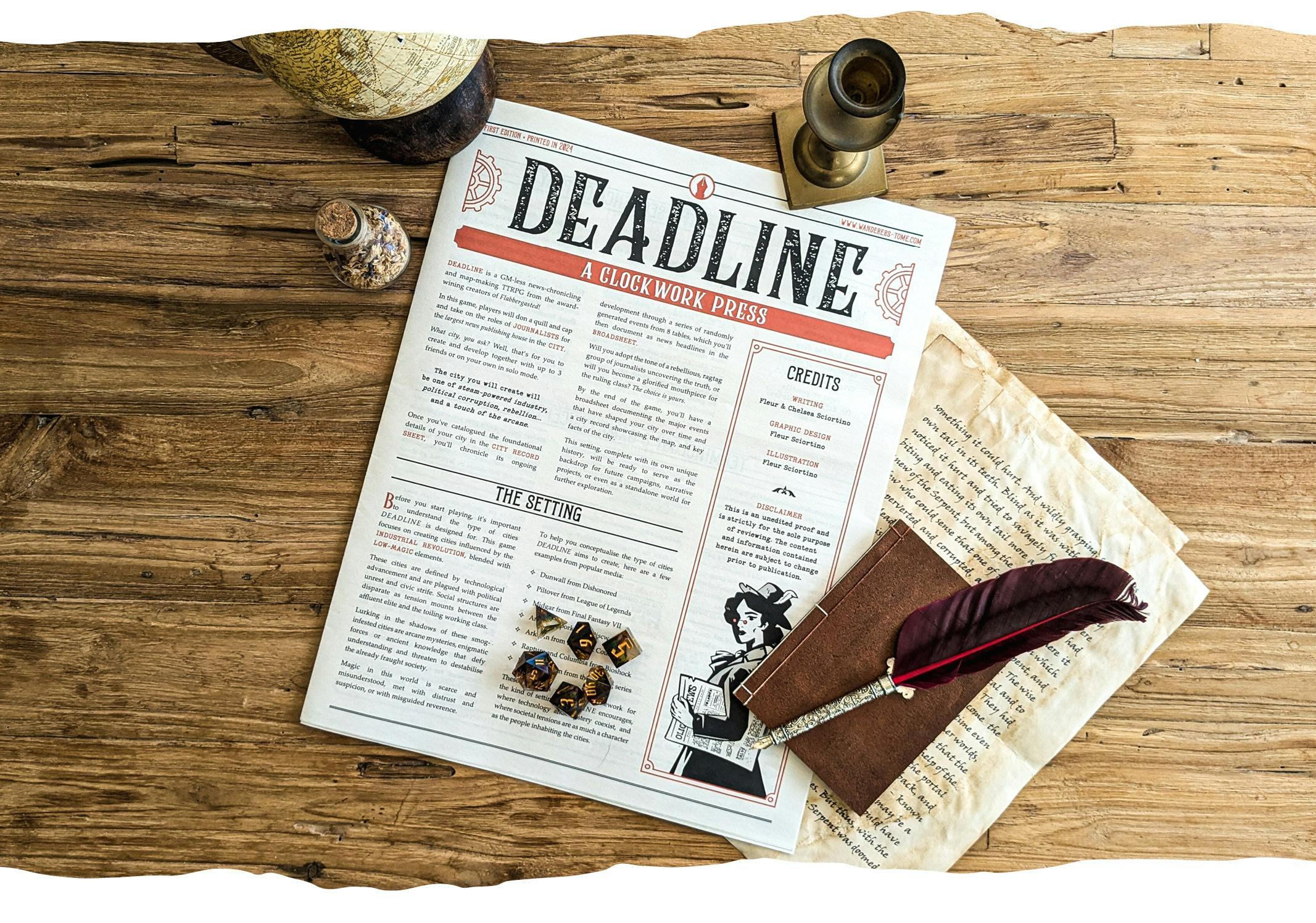 DEADLINE - A Clockwork Pressis a GM-less,news-chronicling, and map-making TTRPG from the creators of the ENNIE-nominated Flabbergasted!In this game, players will don a quill and cap and assume the roles of journalists for the largest news publishing house in the City.