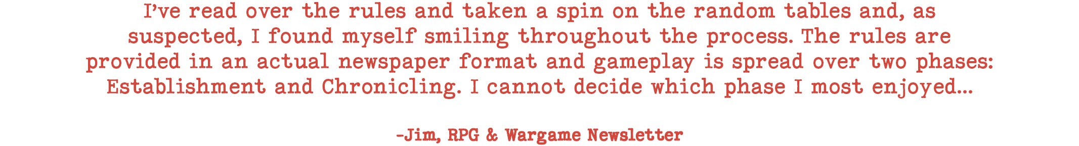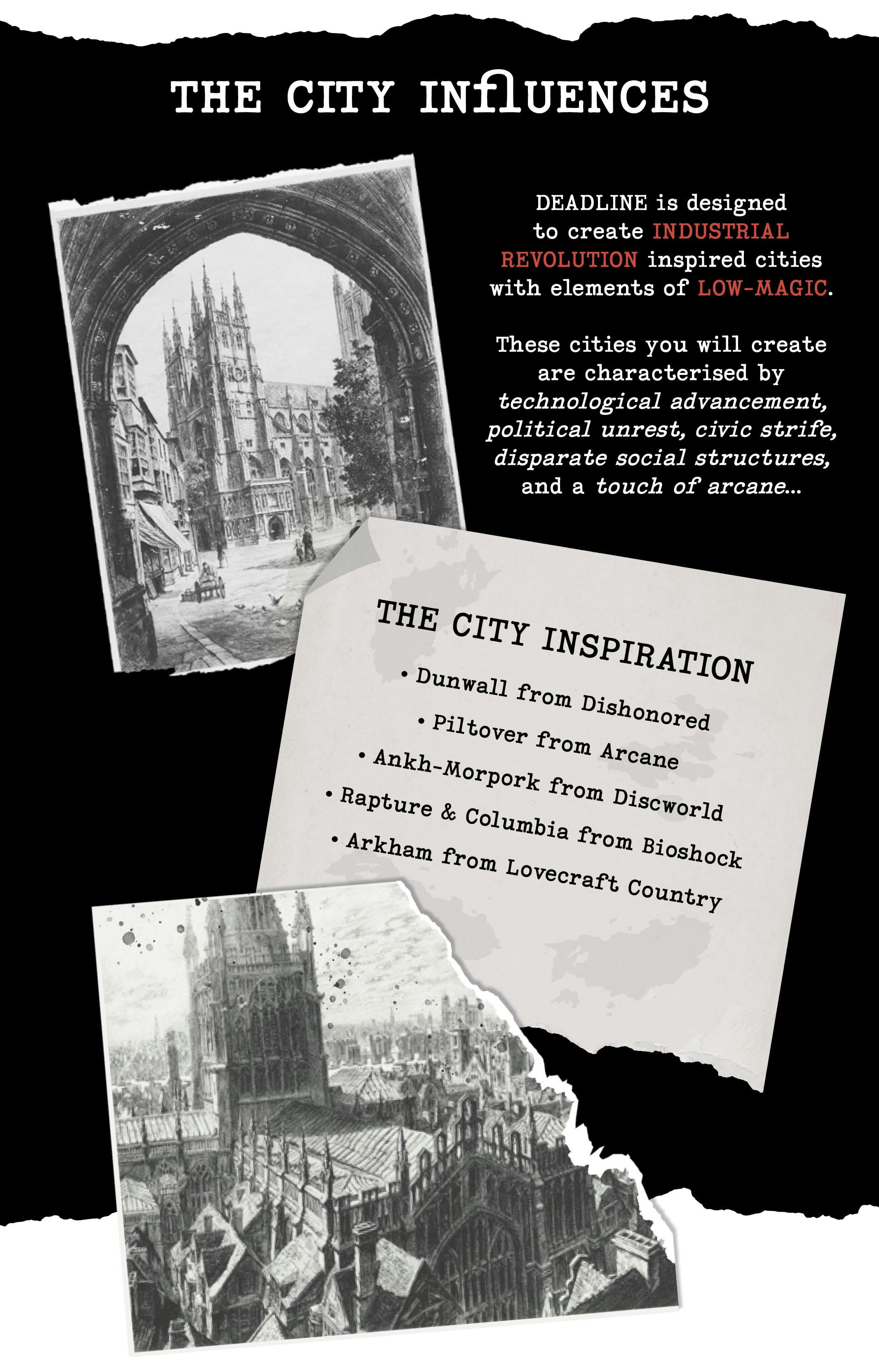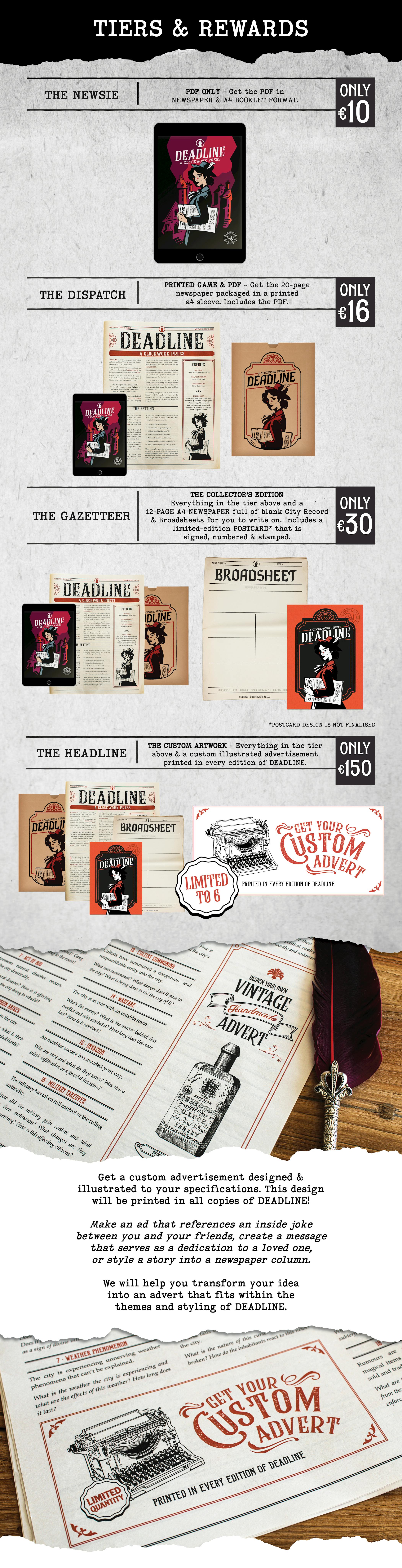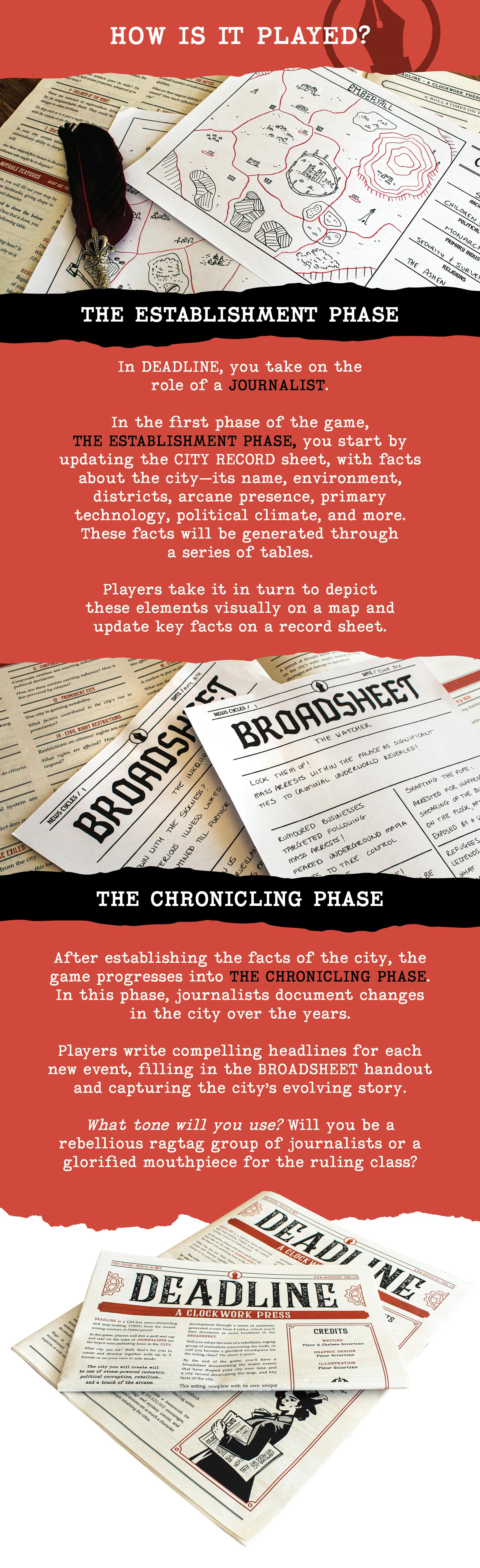 DEADLINE - A Clockwork Pressis a GM-less,news-chronicling, and map-making TTRPG from the creators of the ENNIE-nominated Flabbergasted!In this game, players will don a quill and cap and assume the roles of journalists for the largest news publishing house in the City.