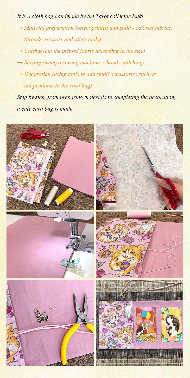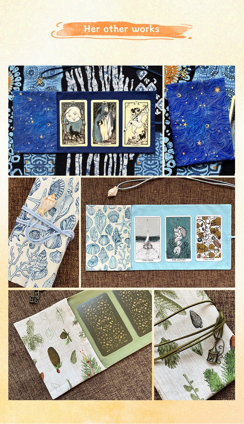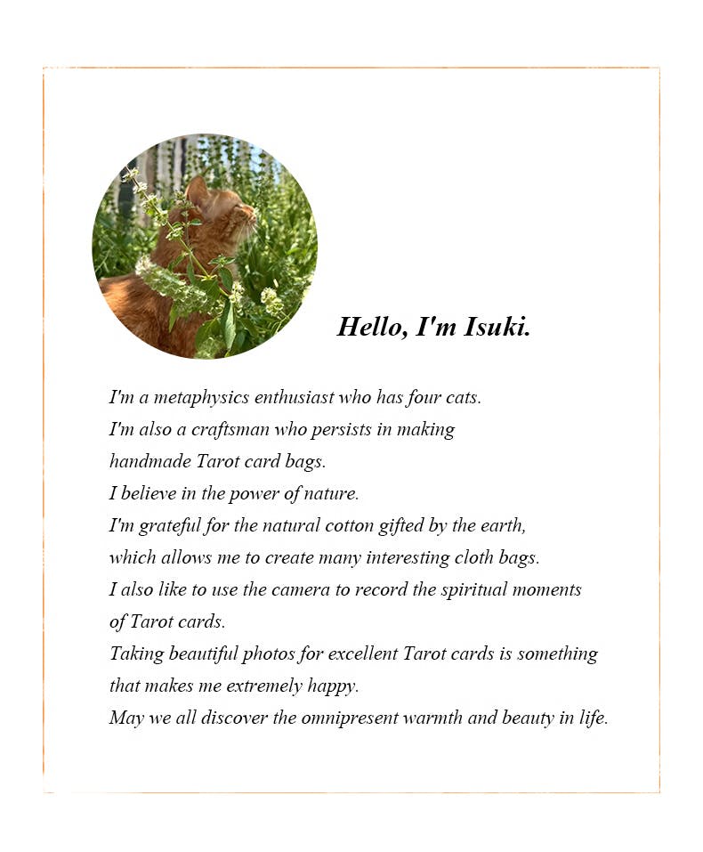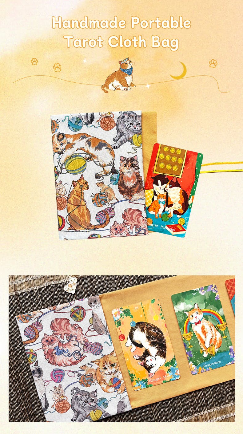 This exquisite piece is hand-stitched by our team member Isuki, with every thread carrying intention: ✦ Natural cotton-linen fabric (eco-friendly dyes) ✦ Double-reinforced stitching to protect your cards from wear ✦ Exclusive cat charm pendant – meticulously hand-attached ✦ Compact 18×12cm size – fits standard tarot decks perfectly