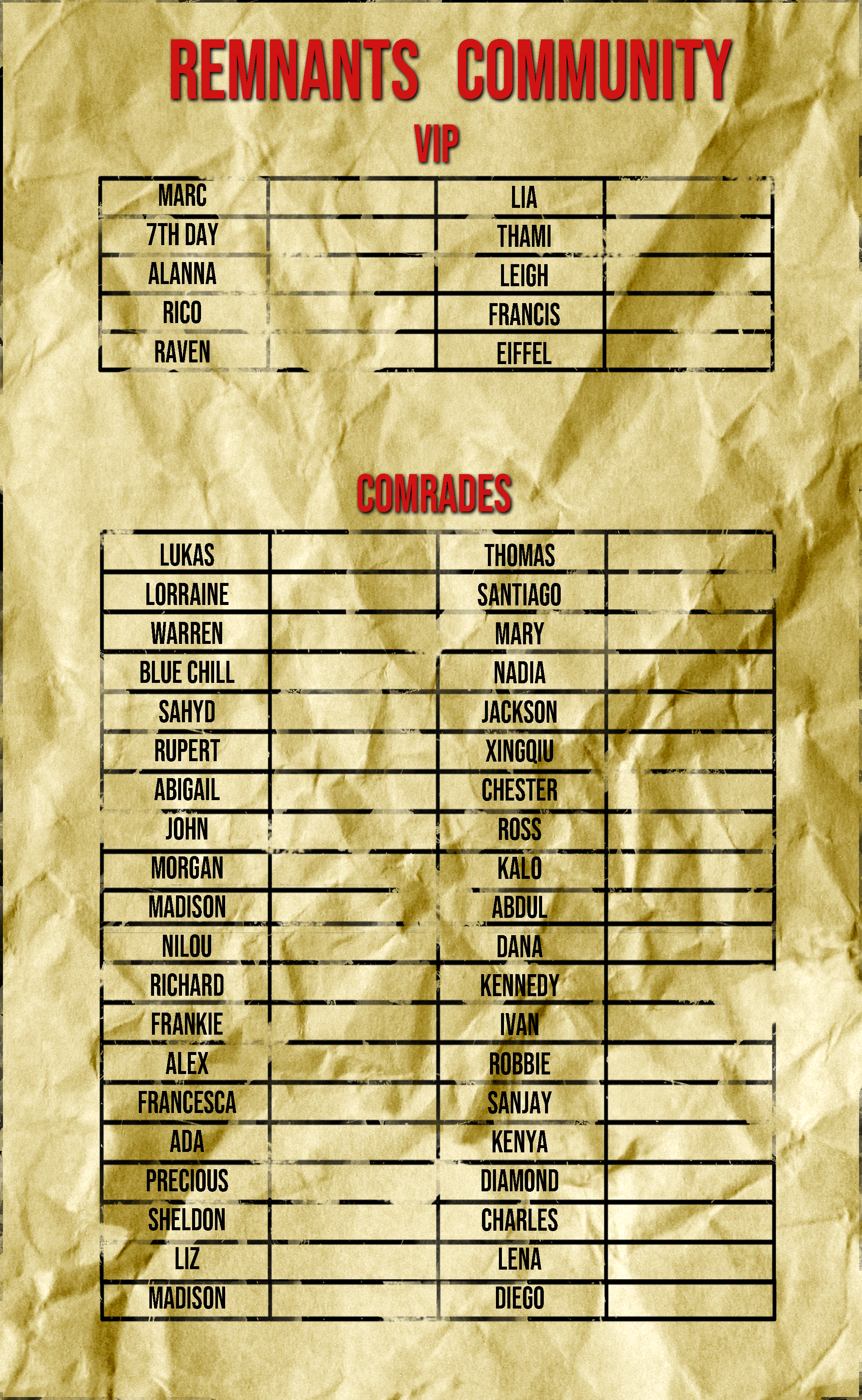 Dopo i Giorni della Piaga, molta gente si è trovata sperduta e lontana da casa. Per affrontare le insidie di un mondo ostile, le persone hanno dovuto unirsi in gruppi variegati. La Comunità dei Remnants ha passato tempi difficili ma è rimasta unita fino ad oggi. Fuggita dal luogo che l'ha ospitati per anni, è ora in cerca di una nuova casa.