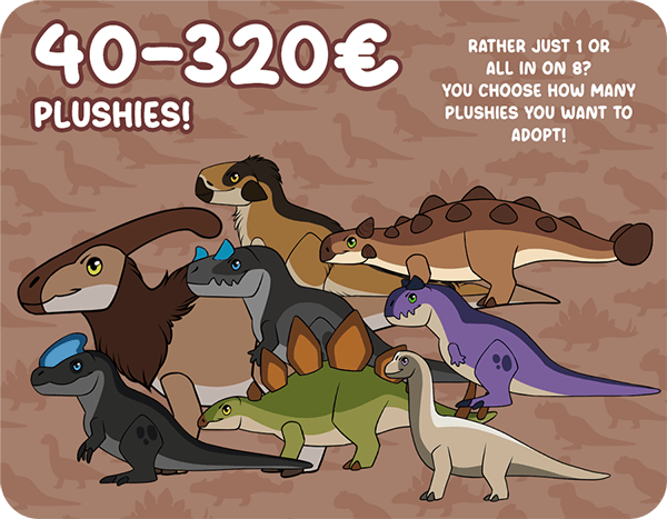 Pick any pledge you like and then have a visit at the add-on section where you can add adoption papers or more plushies. An adoption paper contains a A6 paper that´s designed like a pet ID of your dinosaur, plus it´s favorite snack so it won´t go hungry on it´s way to you. Maybe it leaves something to share with you!