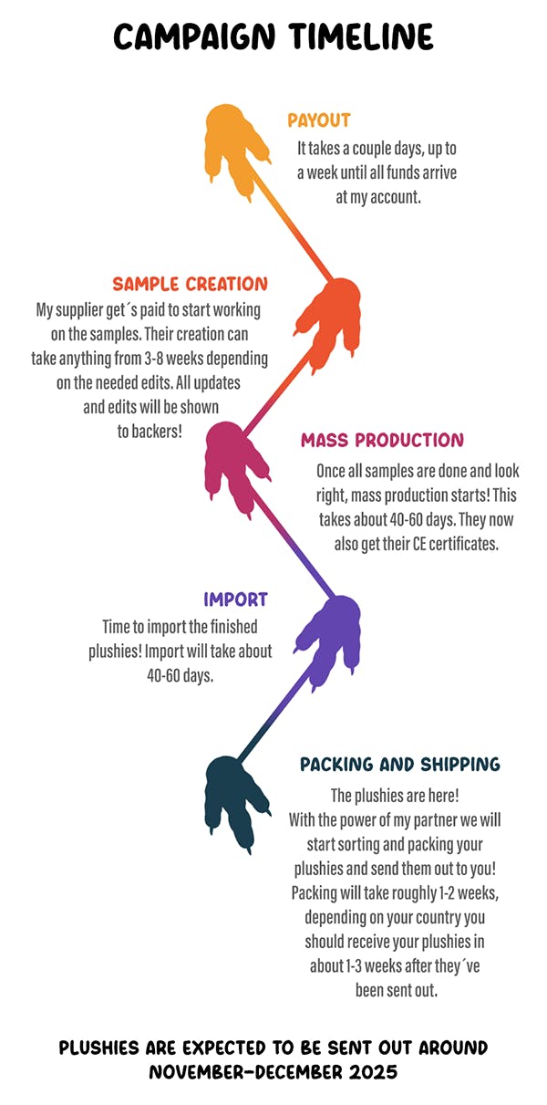 Once approved, it will take another 40-60 days to produce all the plushies which will then be sent to me. This is roughly the time the shipping will be charged for your pledges. Thanks to Backerkit options, it´s now far easier for me to calculate shipping costs more exact unlike on Kickstarter where you had to roughly plan it in before which was kind of risky.
